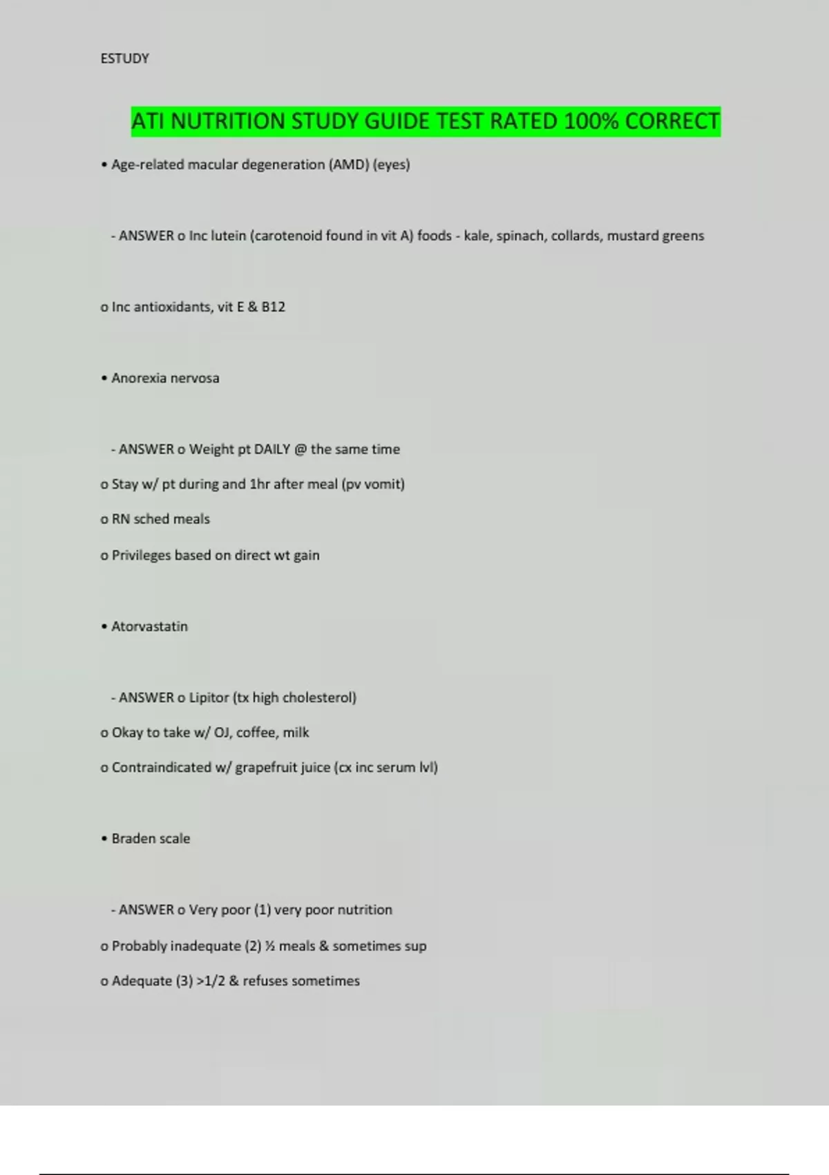 ATI NUTRITION STUDY GUIDE TEST RATED 100% CORRECT