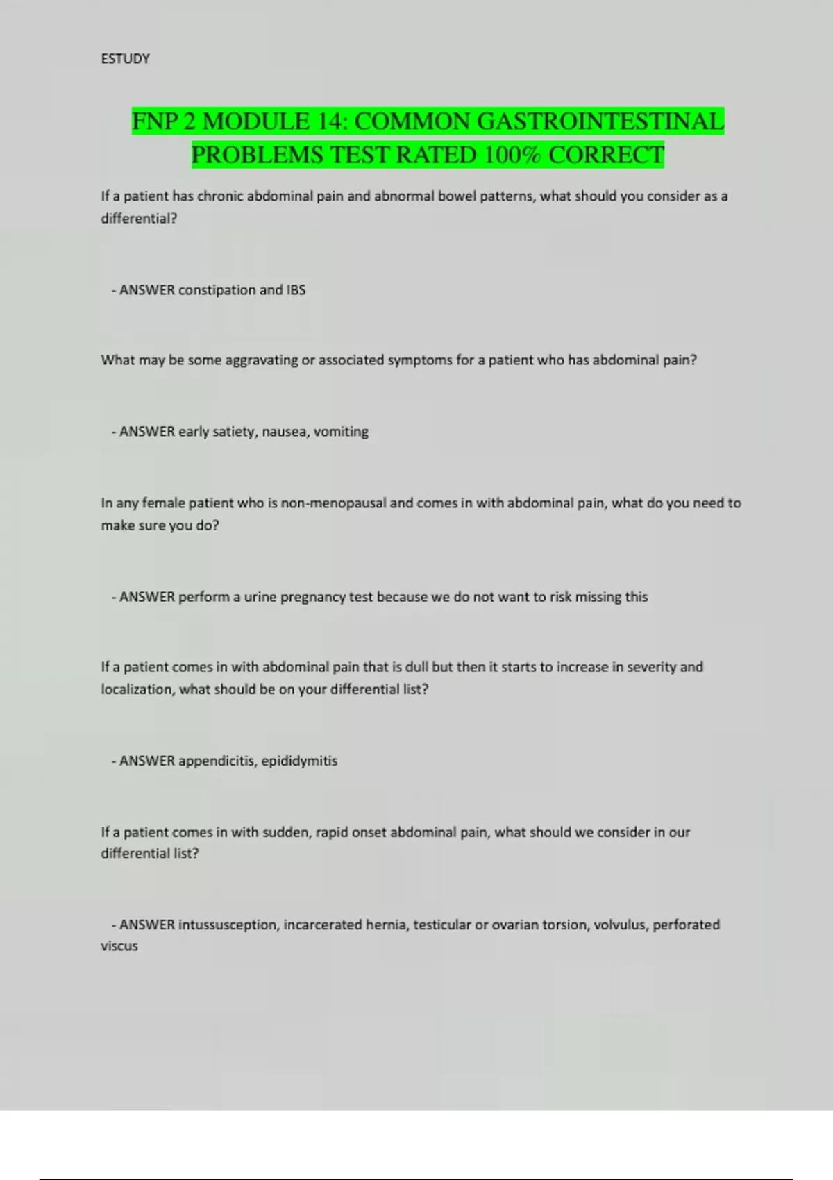 FNP 2 MODULE 14: COMMON GASTROINTESTINAL PROBLEMS TEST RATED 100% CORRECT