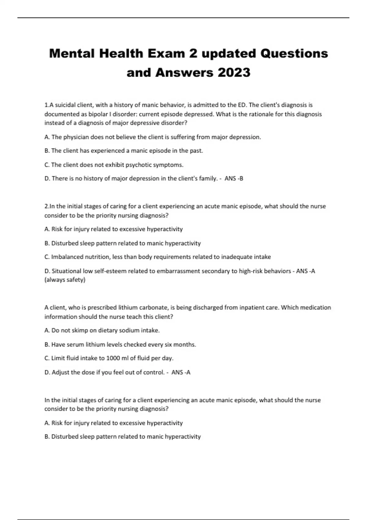 Mental Health Exam 2 updated Questions and Answers 2023 1.A suicidal client, with a history of manic behavior, is admitted to the ED. The client's diagnosis is documented as bipolar I disorder: current episode depressed. What is the rationale for this diagnosis instead of a diagnosis of major depressive disorder? A. The physician does not believe the client is suffering from major depression. B. The client has experienced a manic episode in the past. C. The client does not exhibit psychotic symptoms. D. There is no history of major depression in the client's family. - ANS -B 2.In the initial stages of caring for a client experiencing an acute manic episode, what should the nurse consider to be the priority nursing diagnosis? A. Risk for injury related to excessive hyperactivity B. Disturbed sleep pattern related to manic hyperactivity C. Imbalanced nutrition, less than body requirements related to inadequate intake D. Situational low self-esteem related to embarrassment secondary to high-risk behaviors - ANS -A (always safety) A client, who is prescribed lithium carbonate, is being discharged from inpatient care. Which medication information should the nurse teach this client? A. Do not skimp on dietary sodium intake. B. Have serum lithium levels checked every six months. C. Limit fluid intake to 1000 ml of fluid per day. D. Adjust the dose if you feel out of control. - ANS -A In the initial stages of caring for a client experiencing an acute manic episode, what should the nurse consider to be the priority nursing diagnosis? A. Risk for injury related to excessive hyperactivity B. Disturbed sleep pattern related to manic hyperactivity