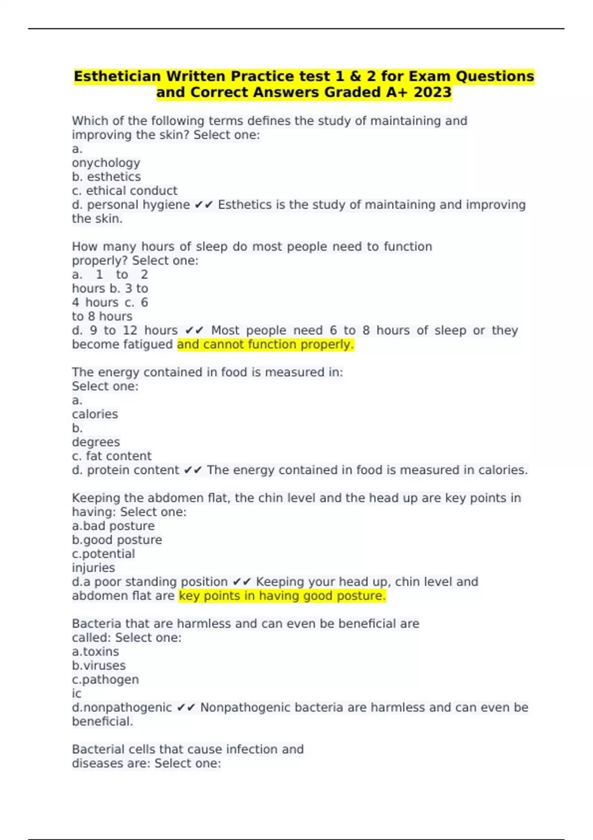 Esthetician Written Practice test 1 & 2 for Exam Questions and Correct Answers Graded A+ 2023 Which of the following terms defines the study of maintaining and improving the skin? Select one: a. onychology b. esthetics c. ethical conduct d. personal hygiene Esthetics is the study of maintaining and improving the skin. How many hours of sleep do most people need to function properly? Select one: a. 1 to 2 hours b. 3 to 4 hours c. 6 to 8 hours d. 9 to 12 hours Most people need 6 to 8 hours of sleep or they become fatigued and cannot function properly. The energy contained in food is measured in: Select one: a. calories b. degrees c. fat content d. protein content The energy contained in food is measured in calories. Keeping the abdomen flat, the chin level and the head up are key points in having: Select one: posture posture tial injuries d.a poor standing position Keeping your head up, chin level and abdomen flat are key points in having good posture. Bacteria that are harmless and can even be beneficial are called: Select one: s es genic thogenic Nonpathogenic bacteria are harmless and can even be beneficial. Bacterial cells that cause infection and diseases are: Select one: xic ative genic thogenic Pathogenic bacterial cells can cause infections and diseases. Infectious bacteria can be easily spread in the workplace in all of the following ways EXCEPT: Select one: hands fingernails minated implements ed nose while sneezing Infectious materials can be easily spread in the workplace by using contaminated implements or via dirty hands and fingernails. A communicable disease refers to a disease that is: Select one: ve thogenic d from one person to another spread from one person to another A disease that is easily spread from one person to another is referred to as communicable. A special group or type of antibodies which render a toxic substance harmless are known as: Select one: s es ria oxins A special group or type of antibodies which render a toxic substance harmless are known as antitoxins. Bacteria can enter the body through all of the following ways EXCEPT: Select one: hy skin in the skin Bacteria can enter the body through the nose, mouth and a break in the skin. A difference between viruses and bacterial infections is: Select one: es can be treated with antibiotics es cannot be treated with antibiotics rial infections cause the common cold rial infections have larger sub-particles The difference between viruses and bacterial infections is that viruses are not treatable with antibiotics, while bacterial infections can generally be treated with appropriate antibiotics. What is a highly infectious disease that infects the liver? Select one: w fever c.Human Hepatitis B Virus (HBV) d.Acquired Immunodeficiency Syndrome (AIDS) Human Hepatitis B Virus (HBV) is a highly infectious disease that infects the liver. An infection that is located in a small, confined area is known as a: Select one: infection al infection gious infection omatic infection An infection that is located in a small, confined area is known as a local infection. Efforts to prevent the spread of communicable diseases is described as: Select one: ity ing tion control d.Safety Data Sheets (SDS) Efforts to prevent the spread of communicable diseases is described as infection control. Virucidals are disinfectants used to kill: Select one: es omonas ul bacteria Virucidals are disinfectants used to kill viruses. The regulatory agency under the U.S. Department of Labor that enforces safety and health standards in the workplace is: Select one: a.EPA b.SDS c.NIOSH d.OSHA OSHA is the agency under the U.S. Department of Labor that enforces safety and health standards in the workplace. Key product information-such as toxicology, first-aid, firefighting measures and ecological information-is provided by the: Select one: a.SDS b.DNR c.EPA d.USDA The SDS provides key information on products regarding toxicology, first- aid, firefighting measures and ecological information. Examples of personal protective equipment (PPE) include all of the following EXCEPT: Select one: s masks y glasses Examples of personal protective equipment (PPE) include gloves, apron, face masks and safety glasses. What is the foundation of infection control efforts and the number one thing you can do to protect yourself and your clients? Select one: antiseptics handwashing lizing multi-use supplies ing and disinfecting your tools The foundation of infection control efforts and the number one thing you can do to protect yourself and your clients is basic handwashing. Which type of light can kill bacteria that cause skin infections? Select one: red light violet light escent light descent light Bacteria that cause skin infections can be killed by ultraviolet light Which of the following terms means the product is less likely to provoke an allergic reaction? Select one: ance genic acterial llergenic Hypoallergenic means the product is less likely to provoke an allergic reaction. Ingredients responsible for producing the desired effect are called: Select one: rvative llergenic ional ingredients rmance ingredients Ingredients responsible for producing the desired effect are called performance ingredients. Which of the following are ingredients that are likely to block or clog the pores and contribute to papules and pustules? Select one: acterial ogenic llergenic -comedogenic Comedogenic ingredients are likely to block or clog the pores and contribute to papules and pustules. Which government agency is responsible for regulating cosmetics in the U.S.? Select one: a.EPA b.FDA c.OTC d.OSHA The FDA is the government agency responsible for regulating cosmetics in the U.S. Jane noticed in her appointment book that all available appointments were completely scheduled for Thursday. In the industry this is called a(n): Select one: l book ok t market If all of your appointment times have been scheduled with clients for a given day or week, you have a full book A client retention s