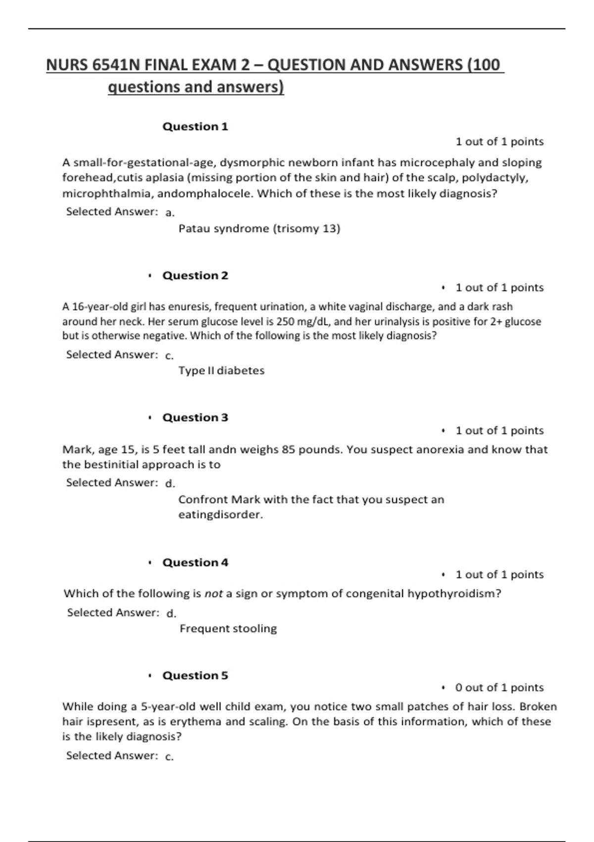 NURS 6541N FINAL EXAM 2 – QUESTION AND ANSWERS (100 questions and answers)Question 1 1 out of 1 points A small-for-gestational-age, dysmorphic newborn infant has microcephaly and sloping forehead, cutis aplasia (missing portion of the skin and hair) of the scalp, polydactyly, microphthalmia, and omphalocele. Which of these is the most likely diagnosis? Selected Answer: a. Patau syndrome (trisomy 13) • Question 2 • 1 out of 1 points A 16-year-old girl has enuresis, frequent urination, a white vaginal discharge, and a dark rash around her neck. Her serum glucose level is 250 mg/dL, and her urinalysis is positive for 2+ glucose but is otherwise negative. Which of the following is the most likely diagnosis? Selected Answer: c. Type II diabetes • Question 3 • 1 out of 1 points Mark, age 15, is 5 feet tall andn weighs 85 pounds. You suspect anorexia and know that the best initial approach is to Selected Answer: g disorder. • Question 4 • 1 out of 1 points Which of the following is not a sign or symptom of congenital hypothyroidism? Selected Answer: d. Frequent stooling • Question 5 • 0 out of 1 points While doing a 5-year-old well child exam, you notice two small patches of hair loss. Broken hair is present, as is erythema and scaling. On the basis of this information, which of these is the likely diagnosis? Selected Answer: c. Confront Mark with the fact that you suspect an