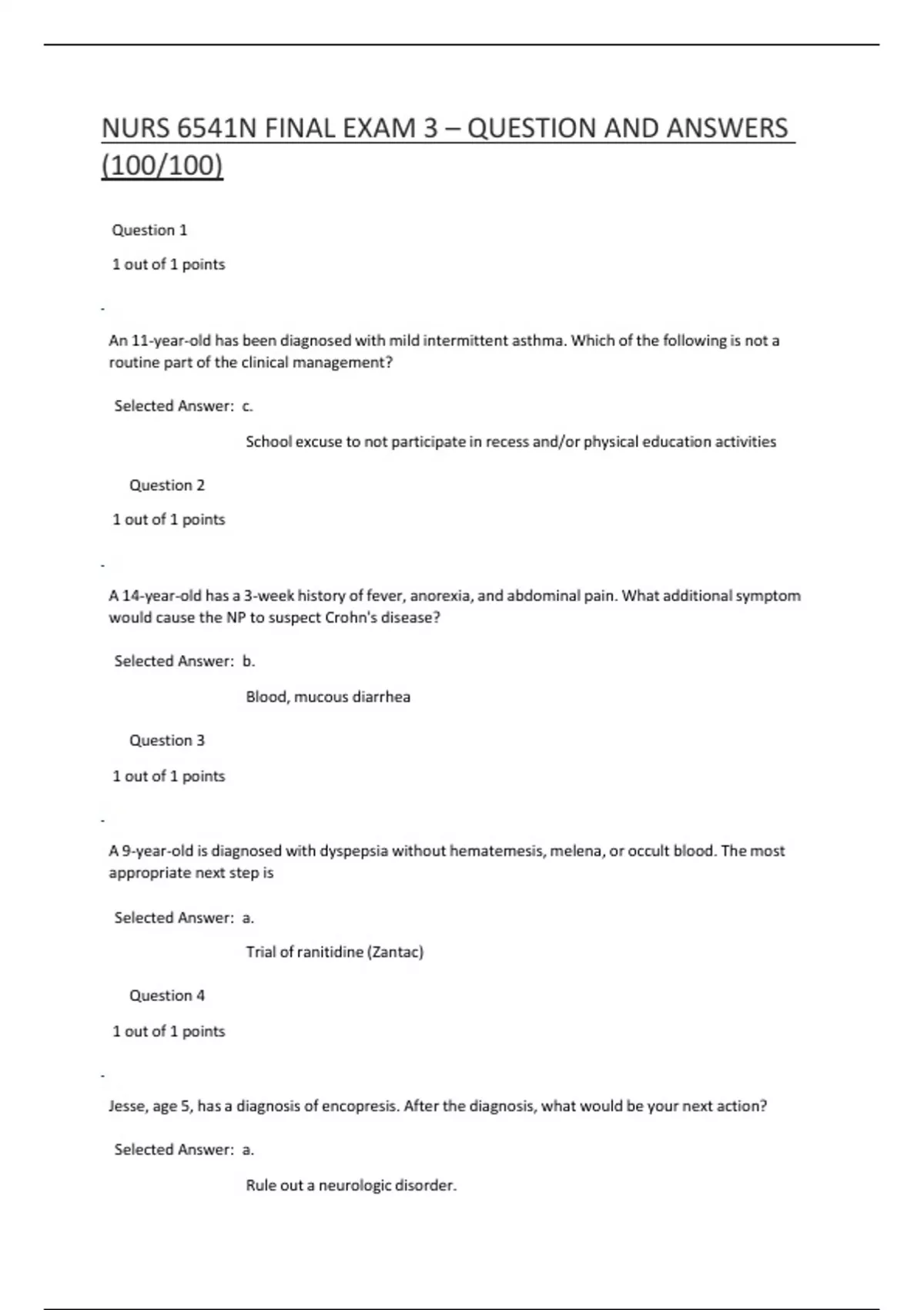 NURS 6541N FINAL EXA M 3 QUESTION AND ANSWERS.Question 1 1 out of 1 points An 11-year-old has been diagnosed with mild intermittent asthma. Which of the following is not a routine part of the clinical management? Selected Answer: c. School excuse to not participate in recess and/or physical education activities Question 2 1 out of 1 points A 14-year-old has a 3-week history of fever, anorexia, and abdominal pain. What additional symptom would cause the NP to suspect Crohn's disease? Selected Answer: b. Blood, mucous diarrhea Question 3 1 out of 1 points A 9-year-old is diagnosed with dyspepsia without hematemesis, melena, or occult blood. The most appropriate next step is Selected Answer: a. Trial of ranitidine (Zantac) Question 4 1 out of 1 points Jesse, age 5, has a diagnosis of encopresis. After the diagnosis, what would be your next action? Selected Answer: a. Rule out a neurologic disorder.