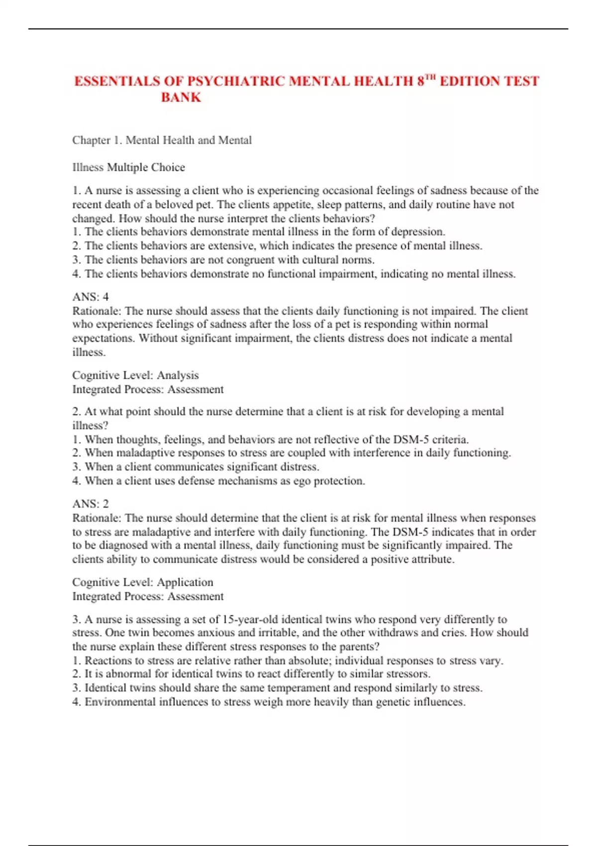 ESSENTIALS OF PSYCHIATRIC MENTAL HEALTH 8TH EDITION TEST BANK Chapter 1. Mental Health and Mental Illness Multiple Choice 1. A nurse is assessing a client who is experiencing occasional feelings of sadness because of the recent death of a beloved pet. The clients appetite, sleep patterns, and daily routine have not changed. How should the nurse interpret the clients behaviors? 1. The clients behaviors demonstrate mental illness in the form of depression. 2. The clients behaviors are extensive, which indicates the presence of mental illness. 3. The clients behaviors are not congruent with cultural norms. 4. The clients behaviors demonstrate no functional impairment, indicating no mental illness. ANS: 4 Rationale: The nurse should assess that the clients daily functioning is not impaired. The client who experiences feelings of sadness after the loss of a pet is responding within normal expectations. Without significant impairment, the clients distress does not indicate a mental illness. Cognitive Level: Analysis Integrated Process: Assessment 2. At what point should the nurse determine that a client is at risk for developing a mental illness? 1. When thoughts, feelings, and behaviors are not reflective of the DSM-5 criteria. 2. When maladaptive responses to stress are coupled with interference in daily functioning. 3. When a client communicates significant distress. 4. When a client uses defense mechanisms as ego protection. ANS: 2 Rationale: The nurse should determine that the client is at risk for mental illness when responses to stress are maladaptive and interfere with daily functioning. The DSM-5 indicates that in order to be diagnosed with a mental illness, daily functioning must be significantly impaired. The clients ability to communicate distress would be considered a positive attribute. Cognitive Level: Application Integrated Process: Assessment