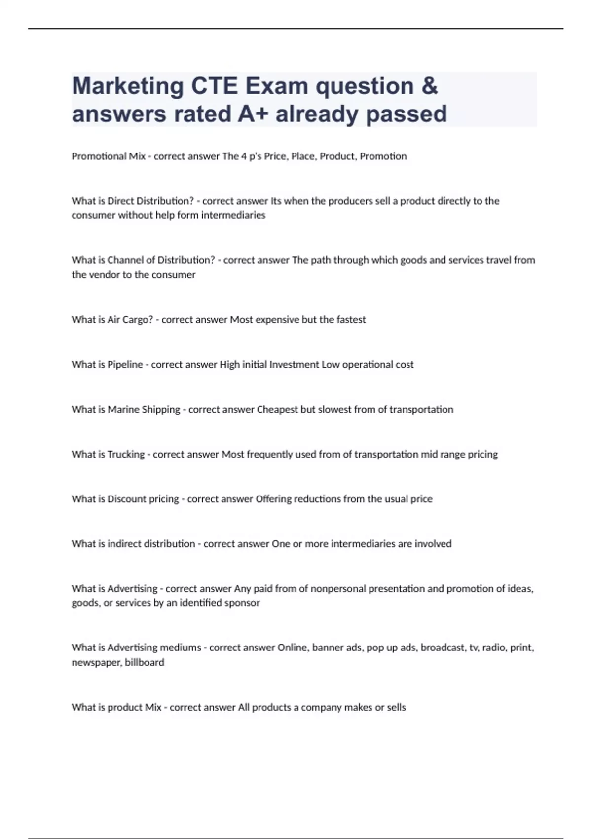 Marketing CTE Exam question & answers rated A+ already passed Promotional Mix - correct answer The 4 p's Price, Place, Product, Promotion What is Direct Distribution? - correct answer Its when the producers sell a product directly to the consumer without help form intermediaries What is Channel of Distribution? - correct answer The path through which goods and services travel from the vendor to the consumer What is Air Cargo? - correct answer Most expensive but the fastest What is Pipeline - correct answer High initial Investment Low operational cost What is Marine Shipping - correct answer Cheapest but slowest from of transportation What is Trucking - correct answer Most frequently used from of transportation mid range pricing What is Discount pricing - correct answer Offering reductions from the usual price What is indirect distribution - correct answer One or more intermediaries are involved What is Advertising - correct answer Any paid from of nonpersonal presentation and promotion of ideas, goods, or services by an identified sponsor What is Advertising mediums - correct answer Online, banner ads, pop up ads, broadcast, tv, radio, print, newspaper, billboard What is product Mix - correct answer All products a company makes or sells