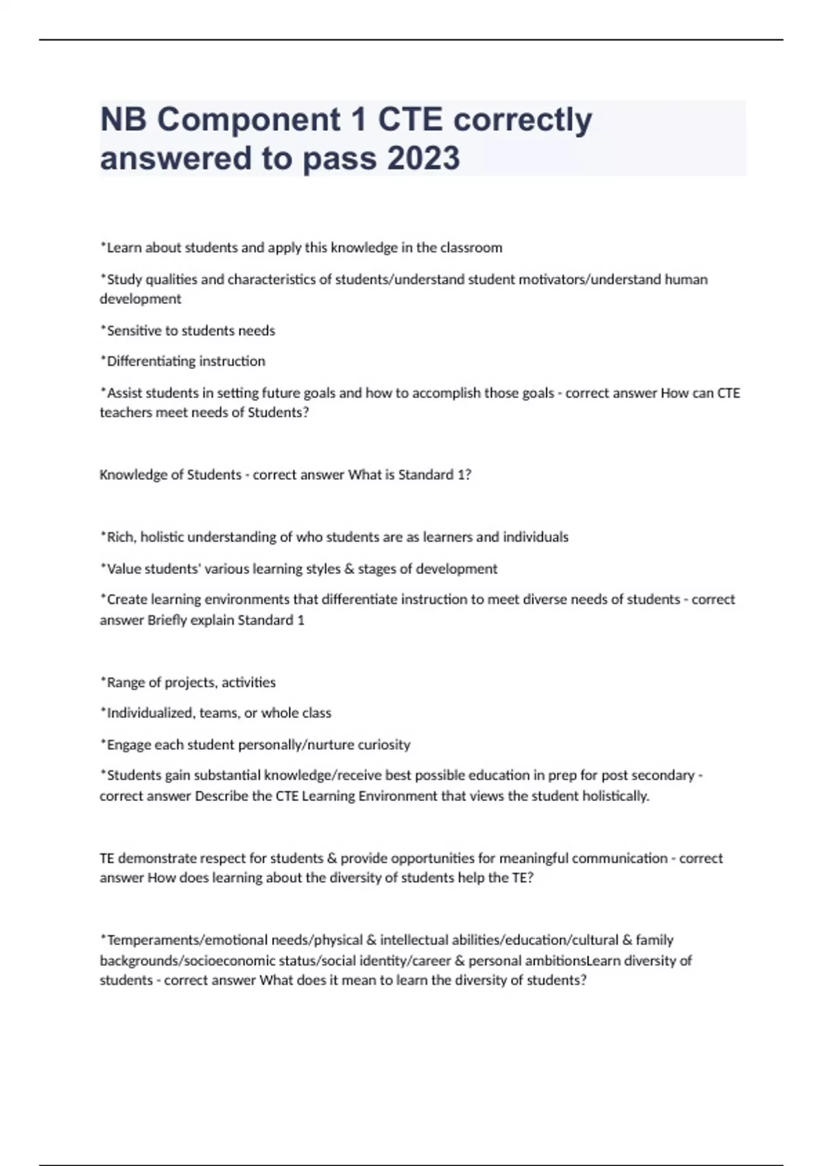 NB Component 1 CTE correctly answered to pass 2023*Learn about students and apply this knowledge in the classroom *Study qualities and characteristics of students/understand student motivators/understand human development *Sensitive to students needs *Differentiating instruction *Assist students in setting future goals and how to accomplish those goals - correct answer How can CTE teachers meet needs of Students? Knowledge of Students - correct answer What is Standard 1? *Rich, holistic understanding of who students are as learners and individuals *Value students' various learning styles & stages of development *Create learning environments that differentiate instruction to meet diverse needs of students - correct answer Briefly explain Standard 1 *Range of projects, activities *Individualized, teams, or whole class *Engage each student personally/nurture curiosity *Students gain substantial knowledge/receive best possible education in prep for post secondary - correct answer Describe the CTE Learning Environment that views the student holistically. TE demonstrate respect for students & provide opportunities for meaningful communication - correct answer How does learning about the diversity of students help the TE? *Temperaments/emotional needs/physical & intellectual abilities/education/cultural & family backgrounds/socioeconomic status/social identity/career & personal ambitionsLearn diversity of students - correct answer What does it mean to learn the diversity of students?
