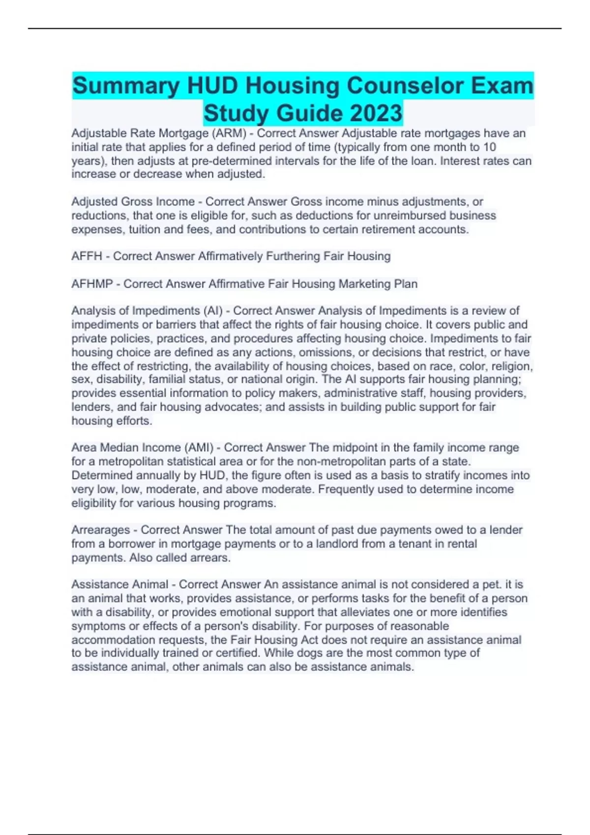 Summary HUD Housing Counselor Exam Study Guide 2023