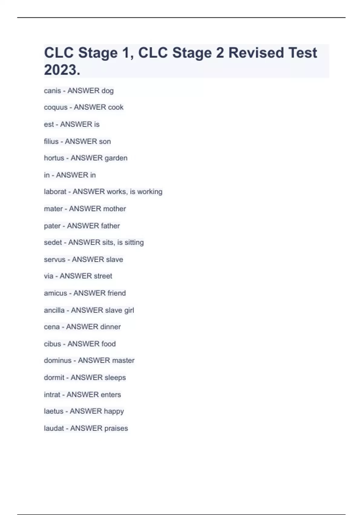 CLC Stage 1, CLC Stage 2 Revised Test 2023. canis - ANSWER dog coquus - ANSWER cook est - ANSWER is filius - ANSWER son hortus - ANSWER garden in - ANSWER in laborat - ANSWER works, is working mater - ANSWER mother pater - ANSWER father sedet - ANSWER sits, is sitting servus - ANSWER slave via - ANSWER street amicus - ANSWER friend ancilla - ANSWER slave girl cena - ANSWER dinner cibus - ANSWER food dominus - ANSWER master dormit - ANSWER sleeps intrat - ANSWER enters laetus - ANSWER happy laudat - ANSWER praises