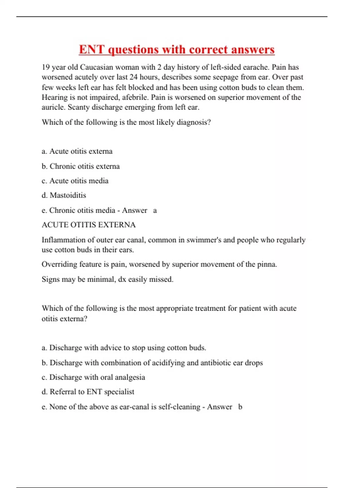 19 year old Caucasian woman with 2 day history of left-sided earache. Pain has worsened acutely over last 24 hours, describes some seepage from ear. Over past few weeks left ear has felt blocked and has been using cotton buds to clean them. Hearing is not impaired, afebrile. Pain is worsened on superior movement of the auricle. Scanty discharge emerging from left ear. Which of the following is the most likely diagnosis? a. Acute otitis externa b. Chronic otitis externa c. Acute otitis media d. Mastoiditis e. Chronic otitis media - Answer a ACUTE OTITIS EXTERNA Inflammation of outer ear canal, common in swimmer's and people who regularly use cotton buds in their ears. Overriding feature is pain, worsened by superior movement of the pinna. Signs may be minimal, dx easily missed. Which of the following is the most appropriate treatment for patient with acute otitis externa? a. Discharge with advice to stop using cotton buds. b. Discharge with combination of acidifying and antibiotic ear drops c. Discharge with oral analgesia