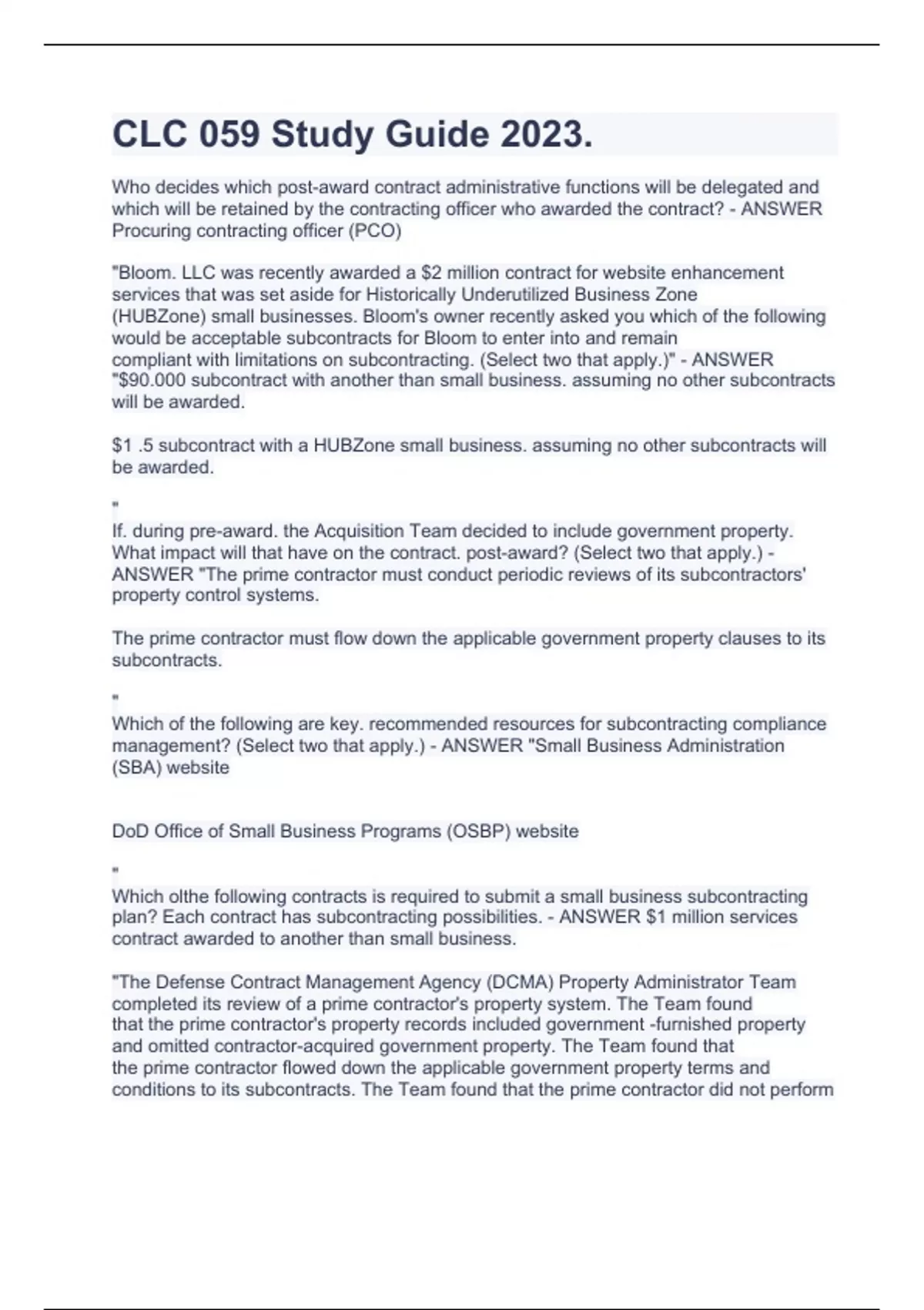 CLC 059 Study Guide 2023.Who decides which post-award contract administrative functions will be delegated and which will be retained by the contracting officer who awarded the contract? - ANSWER Procuring contracting officer (PCO) "Bloom. LLC was recently awarded a $2 million contract for website enhancement services that was set aside for Historically Underutilized Business Zone (HUBZone) small businesses. Bloom's owner recently asked you which of the following would be acceptable subcontracts for Bloom to enter into and remain compliant with limitations on subcontracting. (Select two that apply.)" - ANSWER "$90.000 subcontract with another than small business. assuming no other subcontracts will be awarded. $1 .5 subcontract with a HUBZone small business. assuming no other subcontracts will be awarded. " If. during pre-award. the Acquisition Team decided to include government property. What impact will that have on the contract. post-award? (Select two that apply.) - ANSWER "The prime contractor must conduct periodic reviews of its subcontractors' property control systems. The prime contractor must flow down the applicable government property clauses to its subcontracts. " Which of the following are key. recommended resources for subcontracting compliance management? (Select two that apply.) - ANSWER "Small Business Administration (SBA) website DoD Office of Small Business Programs (OSBP) website " Which olthe following contracts is required to submit a small business subcontracting plan? Each contract has subcontracting possibilities. - ANSWER $1 million services contract awarded to another than small business. "The Defense Contract Management Agency (DCMA) Property Administrator Team completed its review of a prime contractor's property system. The Team found that the prime contractor's property records included government -furnished property and omitted contractor-acquired government property. The Team found that the prime contractor flowed down the applicable government property terms and conditions to its subcontracts. The Team found that the prime contractor did not perform periodic reviews of its subcontractors' property systems. The Team found !that the prime contractor's maintenance program included normal and routine preventative maintenance and repair. Based on the Property Administrator Team's findings and the property system criteria in FAR 52.245-1. how many significant deficiencies are included in the Team's f indings?" - ANSWER 2
