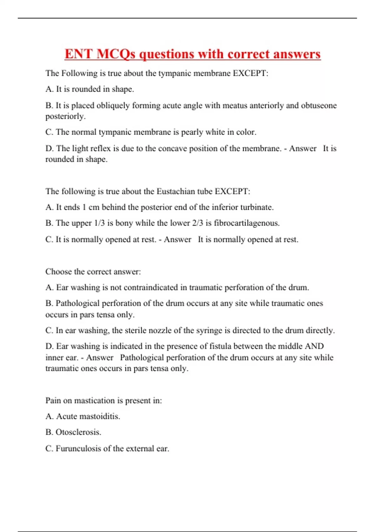 The Following is true about the tympanic membrane EXCEPT: A. It is rounded in shape. B. It is placed obliquely forming acute angle with meatus anteriorly and obtuseone posteriorly. C. The normal tympanic membrane is pearly white in color. D. The light reflex is due to the concave position of the membrane. - Answer It is rounded in shape. The following is true about the Eustachian tube EXCEPT: A. It ends 1 cm behind the posterior end of the inferior turbinate. B. The upper 1/3 is bony while the lower 2/3 is fibrocartilagenous. C. It is normally opened at rest. - Answer It is normally opened at rest. Choose the correct answer: A. Ear washing is not contraindicated in traumatic perforation of the drum. B. Pathological perforation of the drum occurs at any site while traumatic ones occurs in pars tensa only. C. In ear washing, the sterile nozzle of the syringe is directed to the drum directly. D. Ear washing is indicated in the presence of fistula between the middle AND inner ear. - Answer Pathological perforation of the drum occurs at any site while traumatic ones occurs in pars tensa only. Pain on mastication is present in: A. Acute mastoiditis. B. Otosclerosis. C. Furunculosis of the external ear.