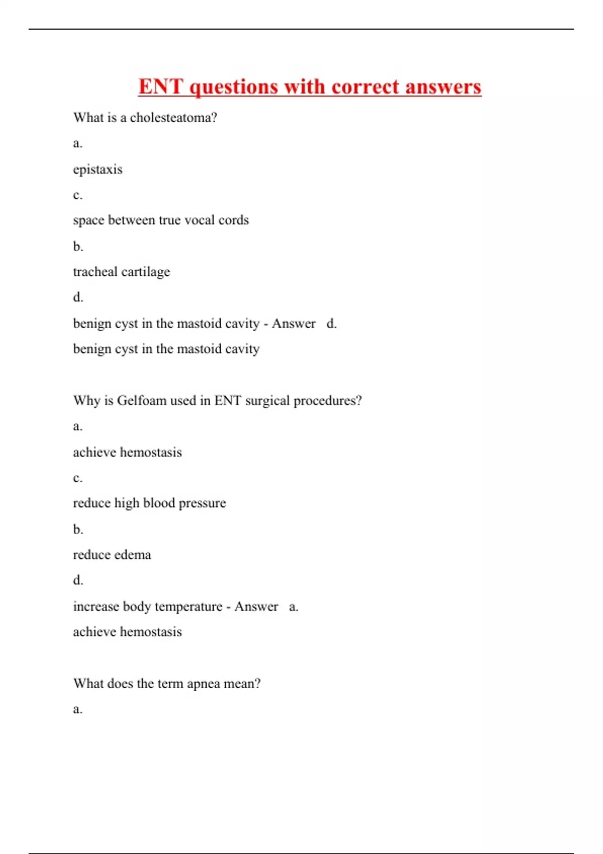 What is a cholesteatoma? a. epistaxis c. space between true vocal cords b. tracheal cartilage d. benign cyst in the mastoid cavity - Answer d. benign cyst in the mastoid cavity Why is Gelfoam used in ENT surgical procedures? a. achieve hemostasis c. reduce high blood pressure b. reduce edema d. increase body temperature - Answer a. achieve hemostasis What does the term apnea mean? a. not breathing