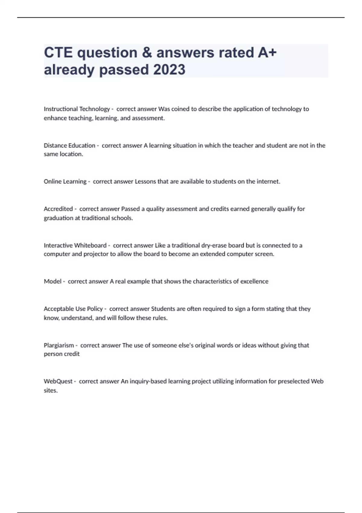 CTE question & answers rated A+ already passed 2023 Instructional Technology - correct answer Was coined to describe the application of technology to enhance teaching, learning, and assessment. Distance Education - correct answer A learning situation in which the teacher and student are not in the same location. Online Learning - correct answer Lessons that are available to students on the internet. Accredited - correct answer Passed a quality assessment and credits earned generally qualify for graduation at traditional schools. Interactive Whiteboard - correct answer Like a traditional dry-erase board but is connected to a computer and projector to allow the board to become an extended computer screen. Model - correct answer A real example that shows the characteristics of excellence Acceptable Use Policy - correct answer Students are often required to sign a form stating that they know, understand, and will follow these rules. Plargiarism - correct answer The use of someone else's original words or ideas without giving that person credit WebQuest - correct answer An inquiry-based learning project utilizing information for preselected Web sites.