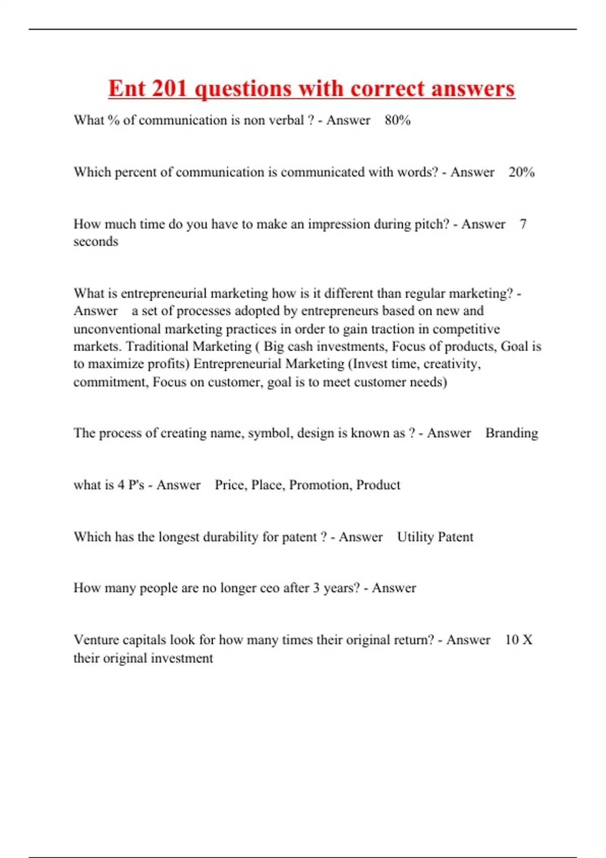 What % of communication is non verbal ? - Answer 80% Which percent of communication is communicated with words? - Answer 20% How much time do you have to make an impression during pitch? - Answer 7 seconds What is entrepreneurial marketing how is it different than regular marketing? - Answer a set of processes adopted by entrepreneurs based on new and unconventional marketing practices in order to gain traction in competitive markets. Traditional Marketing ( Big cash investments, Focus of products, Goal is to maximize profits) Entrepreneurial Marketing (Invest time, creativity, commitment, Focus on customer, goal is to meet customer needs) The process of creating name, symbol, design is known as ? - Answer Branding what is 4 P's - Answer Price, Place, Promotion, Product Which has the longest durability for patent ? - Answer Utility Patent How many people are no longer ceo after 3 years? - Answer