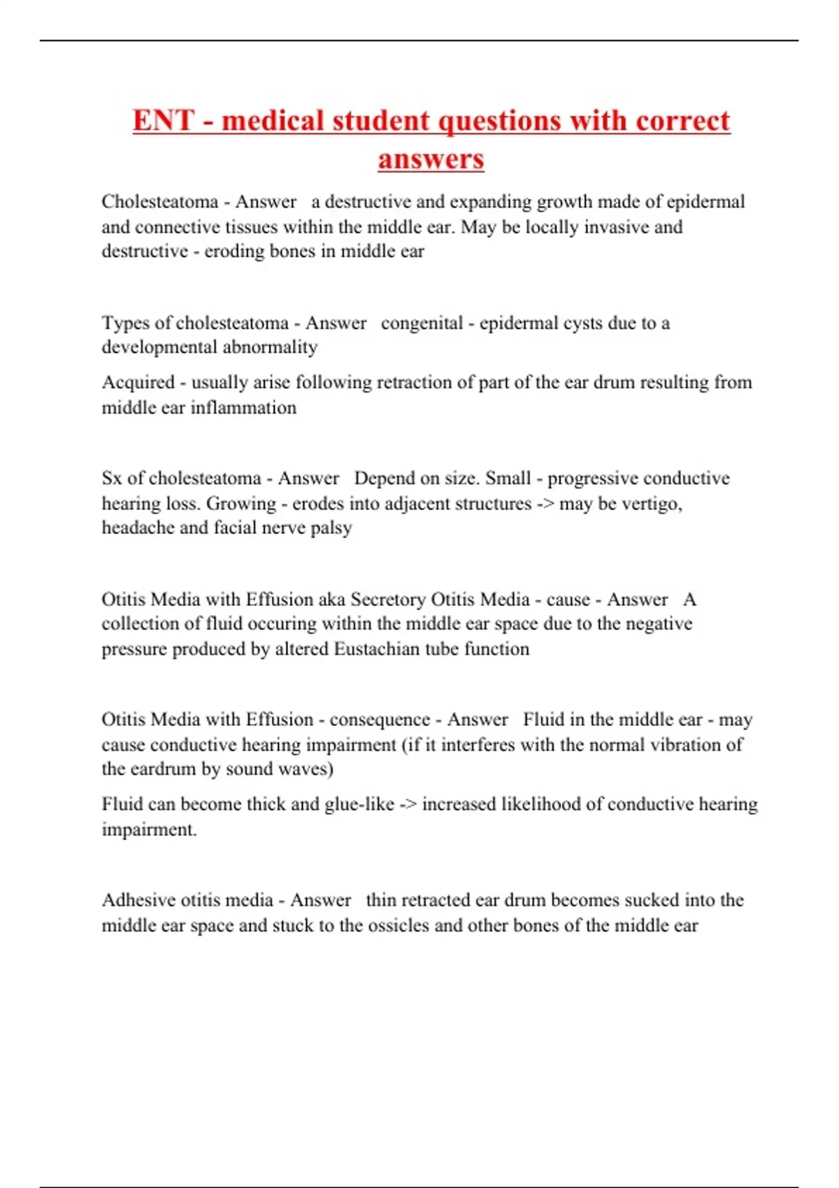 Cholesteatoma - Answer a destructive and expanding growth made of epidermal and connective tissues within the middle ear. May be locally invasive and destructive - eroding bones in middle ear Types of cholesteatoma - Answer congenital - epidermal cysts due to a developmental abnormality Acquired - usually arise following retraction of part of the ear drum resulting from middle ear inflammation Sx of cholesteatoma - Answer Depend on size. Small - progressive conductive hearing loss. Growing - erodes into adjacent structures -> may be vertigo, headache and facial nerve palsy Otitis Media with Effusion aka Secretory Otitis Media - cause - Answer A collection of fluid occuring within the middle ear space due to the negative pressure produced by altered Eustachian tube function