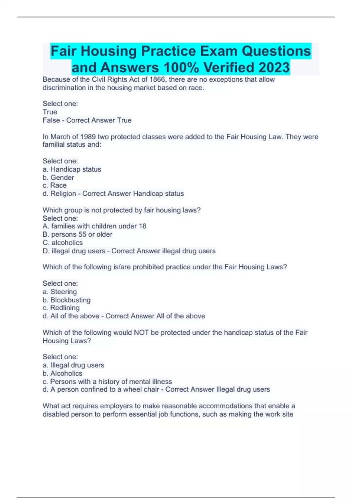 Fair Housing Practice Exam Questions and Answers 100% Verified 2023