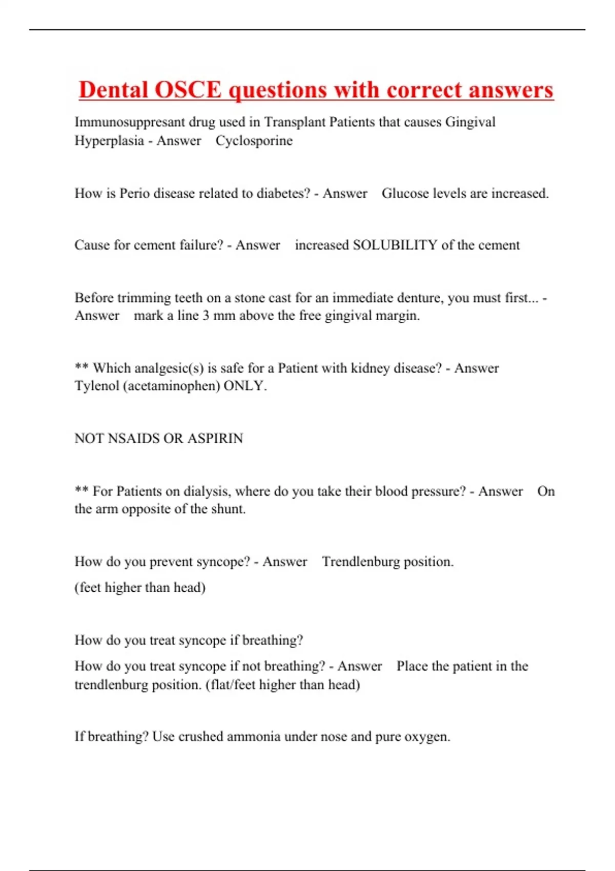 Immunosuppresant drug used in Transplant Patients that causes Gingival Hyperplasia - Answer Cyclosporine How is Perio disease related to diabetes? - Answer Glucose levels are increased. Cause for cement failure? - Answer increased SOLUBILITY of the cement Before trimming teeth on a stone cast for an immediate denture, you must first... - Answer mark a line 3 mm above the free gingival margin. ** Which analgesic(s) is safe for a Patient with kidney disease? - Answer Tylenol (acetaminophen) ONLY. NOT NSAIDS OR ASPIRIN ** For Patients on dialysis, where do you take their blood pressure? - Answer On the arm opposite of the shunt. How do you prevent syncope? - Answer Trendlenburg position. (feet higher than head) How do you treat syncope if breathing? How do you treat syncope if not breathing? - Answer Place the patient in the trendlenburg position. (flat/feet higher than head)