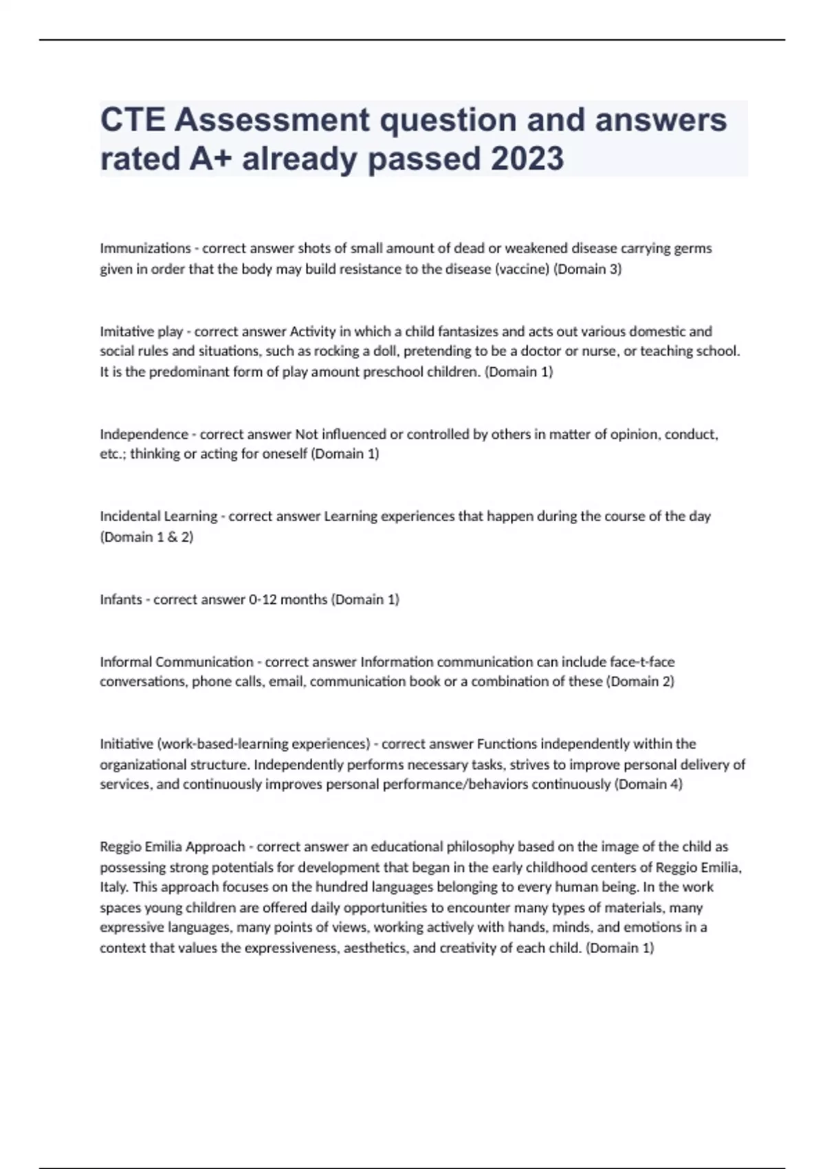 CTE Assessment question and answers rated A+ already passed 2023Immunizations - correct answer shots of small amount of dead or weakened disease carrying germs given in order that the body may build resistance to the disease (vaccine) (Domain 3) Imitative play - correct answer Activity in which a child fantasizes and acts out various domestic and social rules and situations, such as rocking a doll, pretending to be a doctor or nurse, or teaching school. It is the predominant form of play amount preschool children. (Domain 1) Independence - correct answer Not influenced or controlled by others in matter of opinion, conduct, etc.; thinking or acting for oneself (Domain 1) Incidental Learning - correct answer Learning experiences that happen during the course of the day (Domain 1 & 2) Infants - correct answer 0-12 months (Domain 1) Informal Communication - correct answer Information communication can include face-t-face conversations, phone calls, email, communication book or a combination of these (Domain 2) Initiative (work-based-learning experiences) - correct answer Functions independently within the organizational structure. Independently performs necessary tasks, strives to improve personal delivery of services, and continuously improves personal performance/behaviors continuously (Domain 4) Reggio Emilia Approach - correct answer an educational philosophy based on the image of the child as possessing strong potentials for development that began in the early childhood centers of Reggio Emilia, Italy. This approach focuses on the hundred languages belonging to every human being. In the work spaces young children are offered daily opportunities to encounter many types of materials, many expressive languages, many points of views, working actively with hands, minds, and emotions in a context that values the expressiveness, aesthetics, and creativity of each child. (Domain 1)