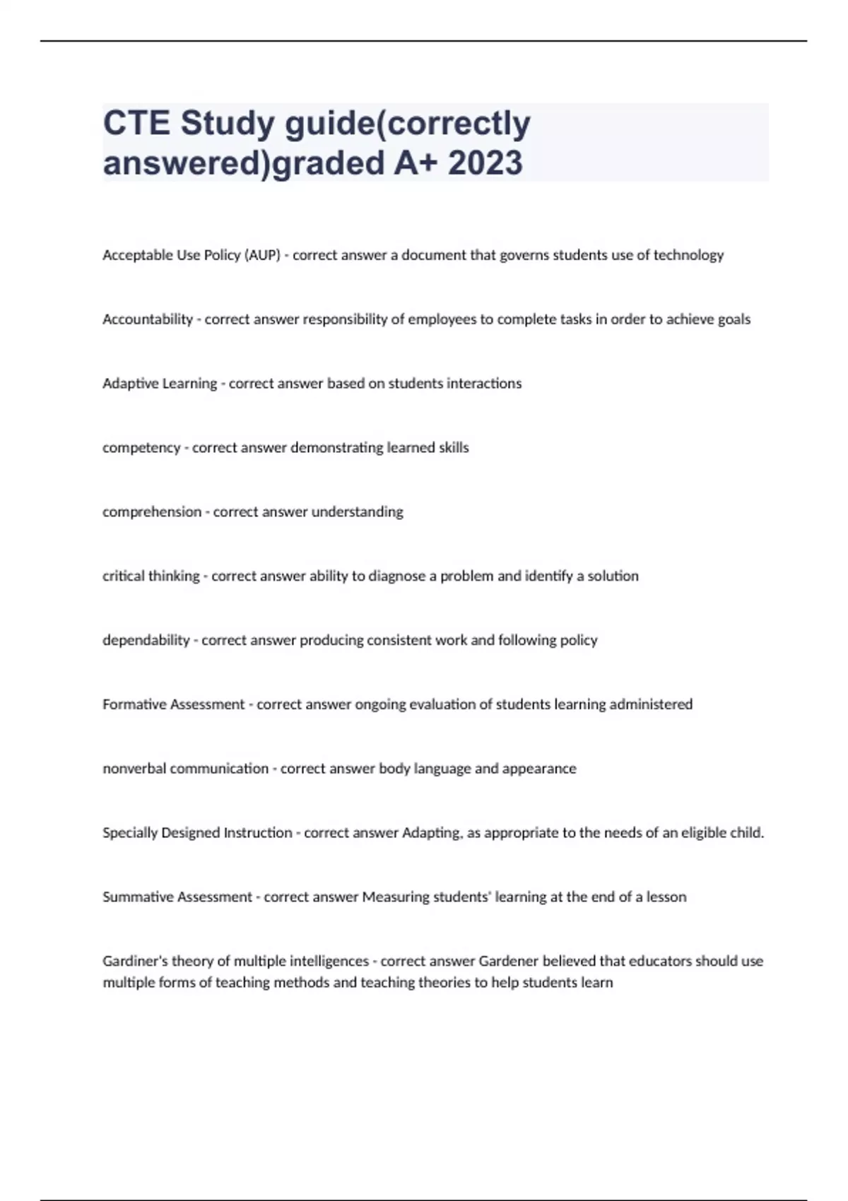 CTE Study guide(correctly answered)graded A+ 2023 Acceptable Use Policy (AUP) - correct answer a document that governs students use of technology Accountability - correct answer responsibility of employees to complete tasks in order to achieve goals Adaptive Learning - correct answer based on students interactions competency - correct answer demonstrating learned skills comprehension - correct answer understanding critical thinking - correct answer ability to diagnose a problem and identify a solution dependability - correct answer producing consistent work and following policy Formative Assessment - correct answer ongoing evaluation of students learning administered nonverbal communication - correct answer body language and appearance Specially Designed Instruction - correct answer Adapting, as appropriate to the needs of an eligible child. Summative Assessment - correct answer Measuring students' learning at the end of a lesson Gardiner's theory of multiple intelligences - correct answer Gardener believed that educators should use multiple forms of teaching methods and teaching theories to help students learn