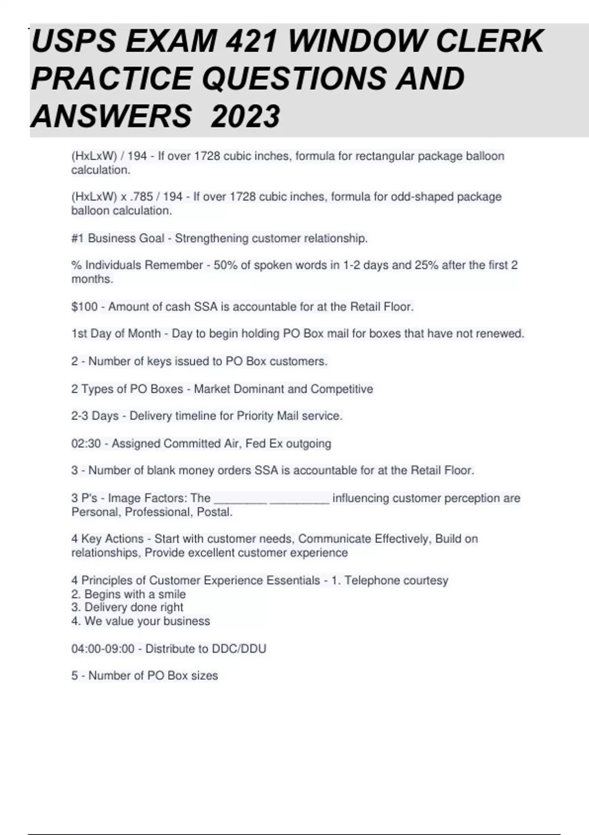 USPS EXAM 421 WINDOW CLERK PRACTICE QUESTIONS AND ANSWERS 2023