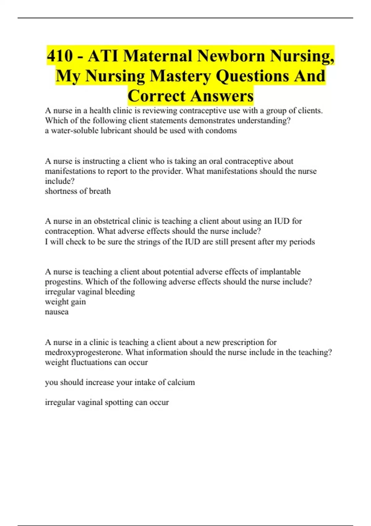 410 - ATI Maternal Newborn Nursing, My Nursing Mastery Questions And Correct Answers