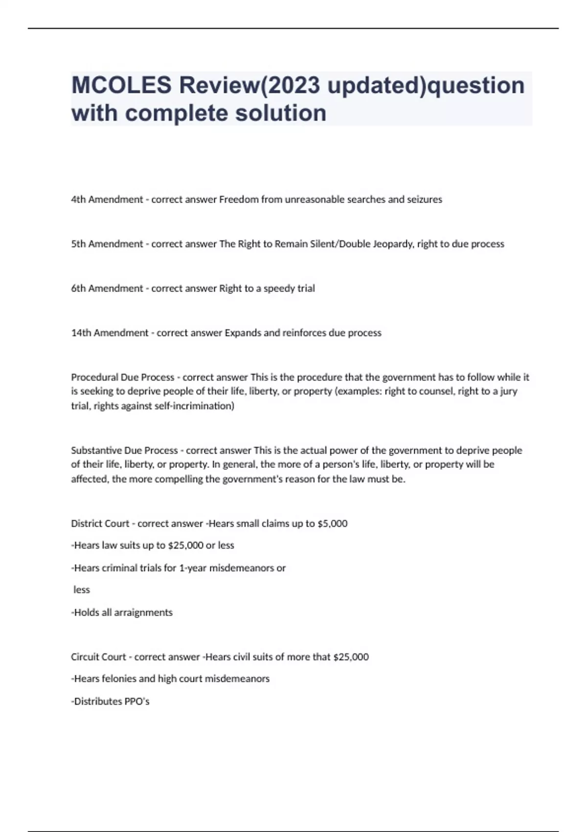 MCOLES Review(2023 updated)question with complete solution4th Amendment - correct answer Freedom from unreasonable searches and seizures 5th Amendment - correct answer The Right to Remain Silent/Double Jeopardy, right to due process 6th Amendment - correct answer Right to a speedy trial 14th Amendment - correct answer Expands and reinforces due process Procedural Due Process - correct answer This is the procedure that the government has to follow while it is seeking to deprive people of their life, liberty, or property (examples: right to counsel, right to a jury trial, rights against self-incrimination) Substantive Due Process - correct answer This is the actual power of the government to deprive people of their life, liberty, or property. In general, the more of a person's life, liberty, or property will be affected, the more compelling the government's reason for the law must be. District Court - correct answer -Hears small claims up to $5,000 -Hears law suits up to $25,000 or less -Hears criminal trials for 1-year misdemeanors or less -Holds all arraignments Circuit Court - correct answer -Hears civil suits of more that $25,000 -Hears felonies and high court misdemeanors -Distributes PPO's
