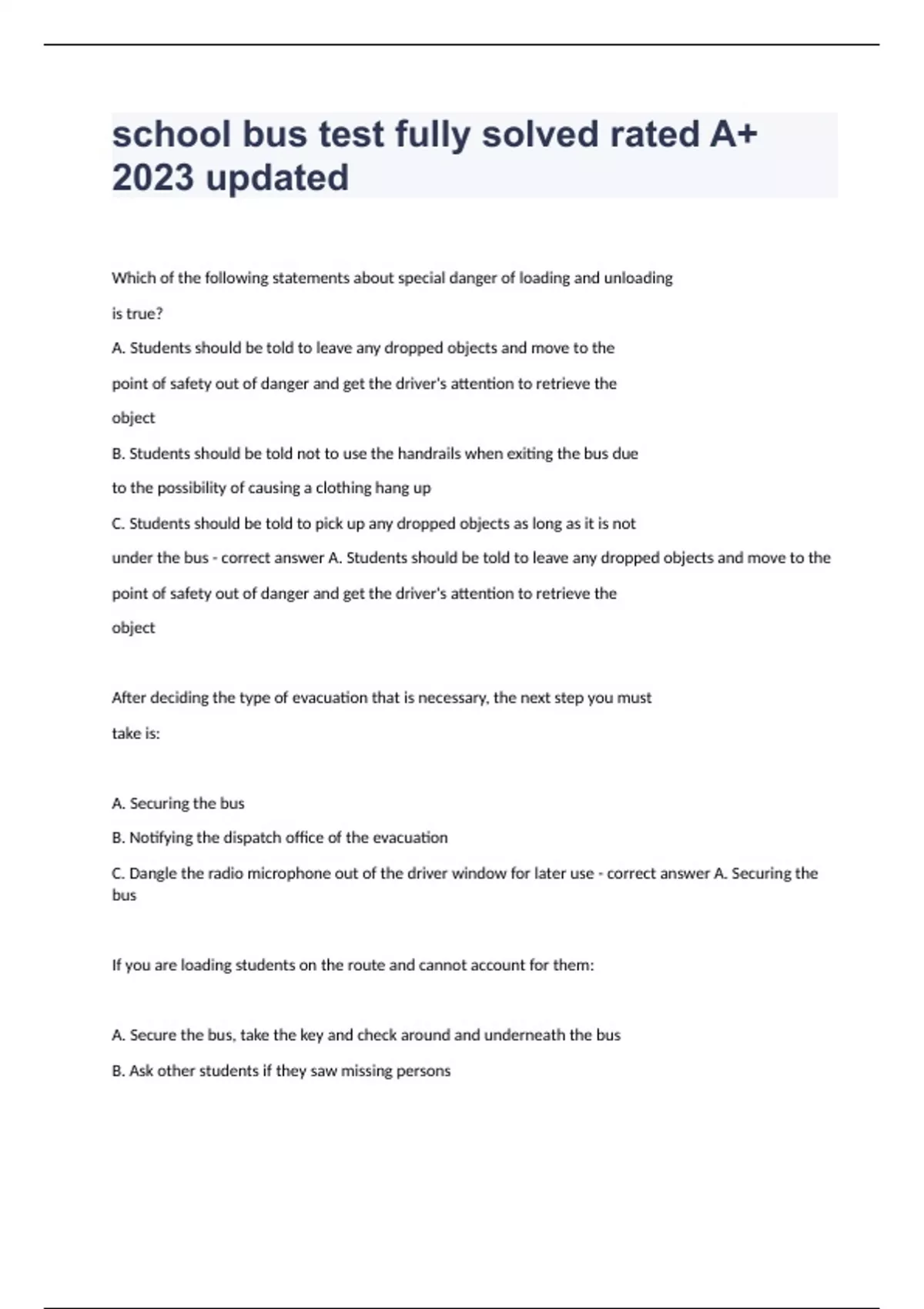 school bus test fully solved rated A+ 2023 updatedWhich of the following statements about special danger of loading and unloading is true? A. Students should be told to leave any dropped objects and move to the point of safety out of danger and get the driver's attention to retrieve the object B. Students should be told not to use the handrails when exiting the bus due to the possibility of causing a clothing hang up C. Students should be told to pick up any dropped objects as long as it is not under the bus - correct answer A. Students should be told to leave any dropped objects and move to the point of safety out of danger and get the driver's attention to retrieve the object After deciding the type of evacuation that is necessary, the next step you must take is: A. Securing the bus B. Notifying the dispatch office of the evacuation C. Dangle the radio microphone out of the driver window for later use - correct answer A. Securing the bus If you are loading students on the route and cannot account for them: A. Secure the bus, take the key and check around and underneath the bus B. Ask other students if they saw missing persons C. Secure the bus and adjust the mirrors - correct answer A. Secure the bus, take the key and check around and underneath the bus Passive railway crossing: A. The type of crossing with no crossbuck sign B. The type of crossing, which does not have any type of traffic c`ontrol device C. The type of crossing on which the driver does not have to stop - correct answer B. The type of crossing, which does not have any type of traffic c`ontrol device School buses must have at least how many emergency exits? A. 4 B. 1 C.2 - correct answer A. 4 What color are all school buses painted? A. Florescent yeUow B. Orange yellow C. National school bus yeHow - correct answer C. National school bus yeHow 7. If students must cross the street, when they get off the bus, which statement is true? A. When the driver signals that it is safe to proceed, the students must run across the street to reduce the exposure to danger B. For crossing, students should make eye contact with the bus driver and wait for the driver's signal that it is safe to proceed C. If the bus is equipped with the crossing gate, the danger of running over