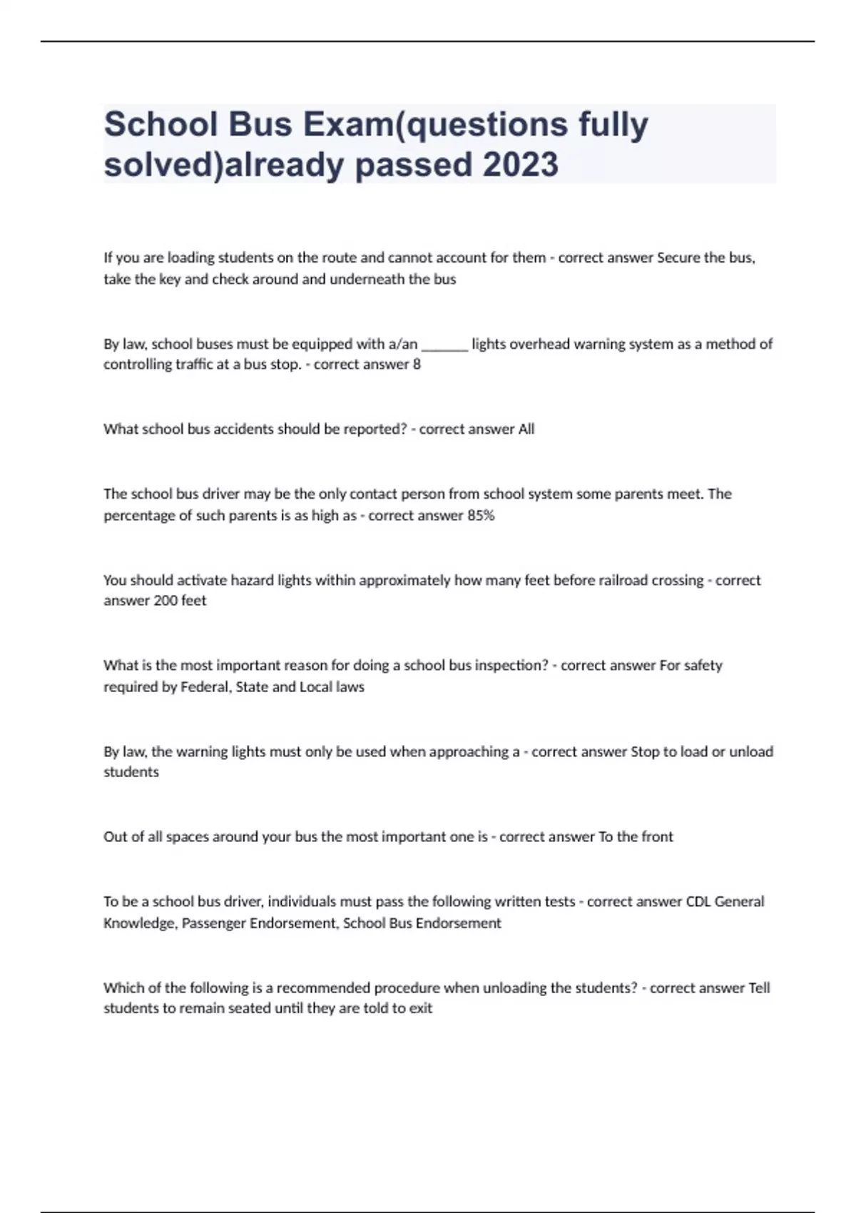 School Bus Exam(questions fully solved)already passed 2023If you are loading students on the route and cannot account for them - correct answer Secure the bus, take the key and check around and underneath the bus By law, school buses must be equipped with a/an ______ lights overhead warning system as a method of controlling traffic at a bus stop. - correct answer 8 What school bus accidents should be reported? - correct answer All The school bus driver may be the only contact person from school system some parents meet. The percentage of such parents is as high as - correct answer 85% You should activate hazard lights within approximately how many feet before railroad crossing - correct answer 200 feet What is the most important reason for doing a school bus inspection? - correct answer For safety required by Federal, State and Local laws By law, the warning lights must only be used when approaching a - correct answer Stop to load or unload students Out of all spaces around your bus the most important one is - correct answer To the front To be a school bus driver, individuals must pass the following written tests - correct answer CDL General Knowledge, Passenger Endorsement, School Bus Endorsement Which of the following is a recommended procedure when unloading the students? - correct answer Tell students to remain seated until they are told to exit