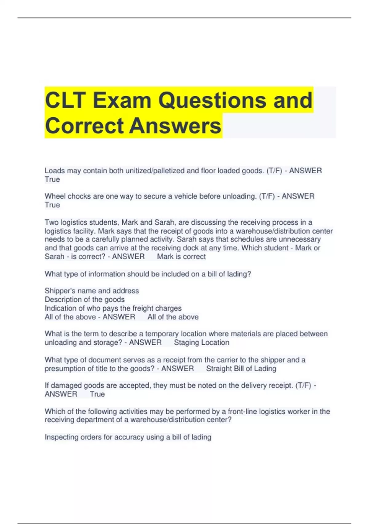 CLT Exam Questions and Correct Answers Loads may contain both unitized/palletized and floor loaded goods. (T/F) - ANSWER True Wheel chocks are one way to secure a vehicle before unloading. (T/F) - ANSWER True Two logistics students, Mark and Sarah, are discussing the receiving process in a logistics facility. Mark says that the receipt of goods into a warehouse/distribution center needs to be a carefully planned activity. Sarah says that schedules are unnecessary and that goods can arrive at the receiving dock at any time. Which student - Mark or Sarah - is correct? - ANSWER Mark is correct What type of information should be included on a bill of lading? Shipper's name and address Description of the goods Indication of who pays the freight charges All of the above - ANSWER All of the above What is the term to describe a temporary location where materials are placed between unloading and storage? - ANSWER Staging Location What type of document serves as a receipt from the carrier to the shipper and a presumption of title to the goods? - ANSWER Straight Bill of Lading If damaged goods are accepted, they must be noted on the delivery receipt. (T/F) - ANSWER True Which of the following activities may be performed by a front-line logistics worker in the receiving department of a warehouse/distribution center? Inspecting orders for accuracy using a bill of lading Moving goods from the trailer to a storage location using hand trucks or automated systems Employing proper safety devices such as wheel chocks prior to unloading All of the above - ANSWER All of the above Which of the following is issued by the carrier as proof of delivery? - ANSWER Delivery Receipt