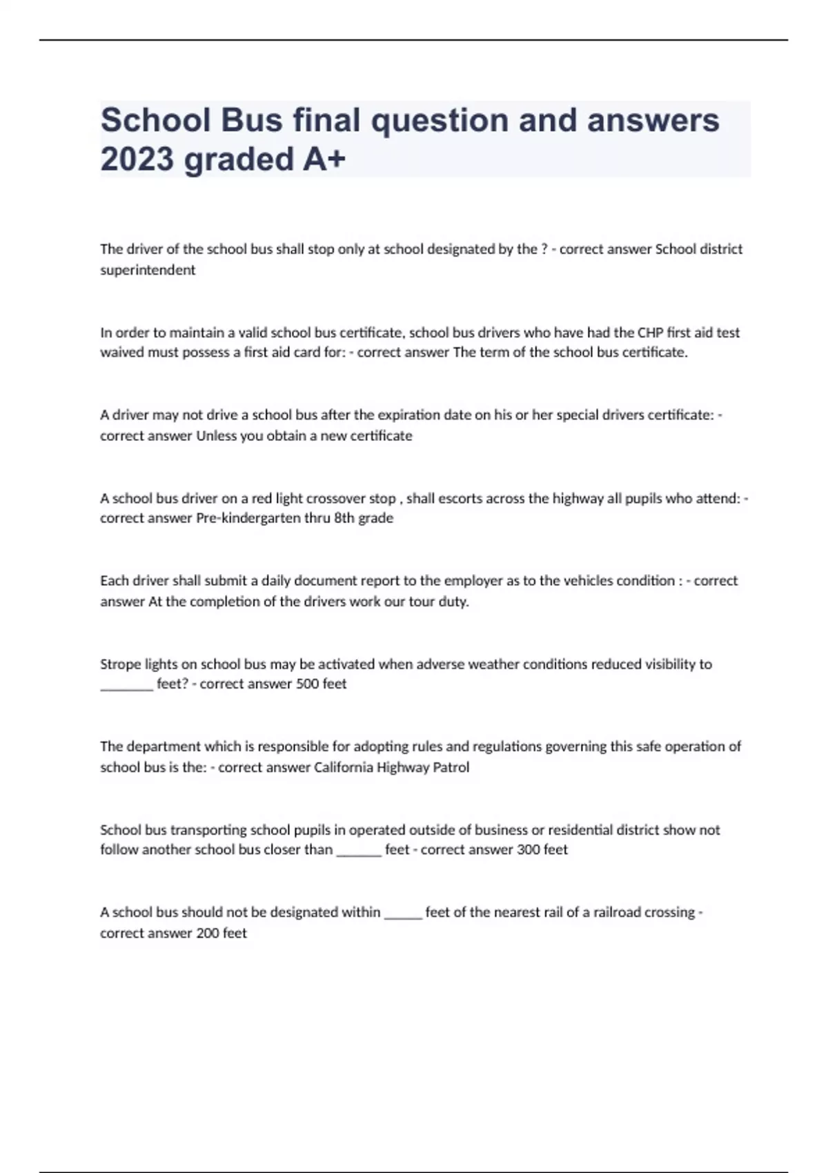 School Bus final question and answers 2023 graded A+The driver of the school bus shall stop only at school designated by the ? - correct answer School district superintendent In order to maintain a valid school bus certificate, school bus drivers who have had the CHP first aid test waived must possess a first aid card for: - correct answer The term of the school bus certificate. A driver may not drive a school bus after the expiration date on his or her special drivers certificate: - correct answer Unless you obtain a new certificate A school bus driver on a red light crossover stop , shall escorts across the highway all pupils who attend: - correct answer Pre-kindergarten thru 8th grade Each driver shall submit a daily document report to the employer as to the vehicles condition : - correct answer At the completion of the drivers work our tour duty. Strope lights on school bus may be activated when adverse weather conditions reduced visibility to _______ feet? - correct answer 500 feet The department which is responsible for adopting rules and regulations governing this safe operation of school bus is the: - correct answer California Highway Patrol School bus transporting school pupils in operated outside of business or residential district show not follow another school bus closer than ______ feet - correct answer 300 feet A school bus should not be designated within _____ feet of the nearest rail of a railroad crossing - correct answer 200 feet