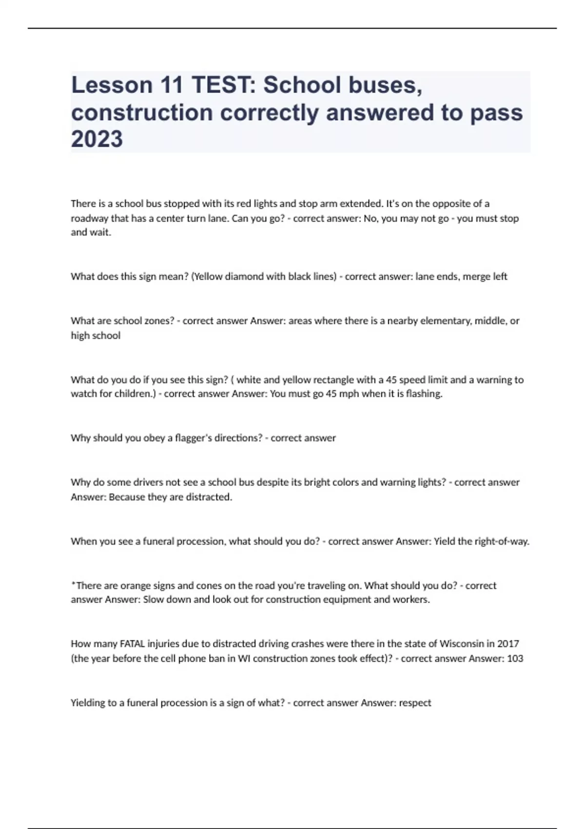 Lesson 11 TEST: School buses, construction correctly answered to pass 2023There is a school bus stopped with its red lights and stop arm extended. It's on the opposite of a roadway that has a center turn lane. Can you go? - correct answer: No, you may not go - you must stop and wait. What does this sign mean? (Yellow diamond with black lines) - correct answer: lane ends, merge left What are school zones? - correct answer Answer: areas where there is a nearby elementary, middle, or high school What do you do if you see this sign? ( white and yellow rectangle with a 45 speed limit and a warning to watch for children.) - correct answer Answer: You must go 45 mph when it is flashing. Why should you obey a flagger's directions? - correct answer Why do some drivers not see a school bus despite its bright colors and warning lights? - correct answer Answer: Because they are distracted. When you see a funeral procession, what should you do? - correct answer Answer: Yield the right-of-way. *There are orange signs and cones on the road you're traveling on. What should you do? - correct answer Answer: Slow down and look out for construction equipment and workers. How many FATAL injuries due to distracted driving crashes were there in the state of Wisconsin in 2017 (the year before the cell phone ban in WI construction zones took effect)? - correct answer Answer: 103 Yielding to a funeral procession is a sign of what? - correct answer Answer: respect