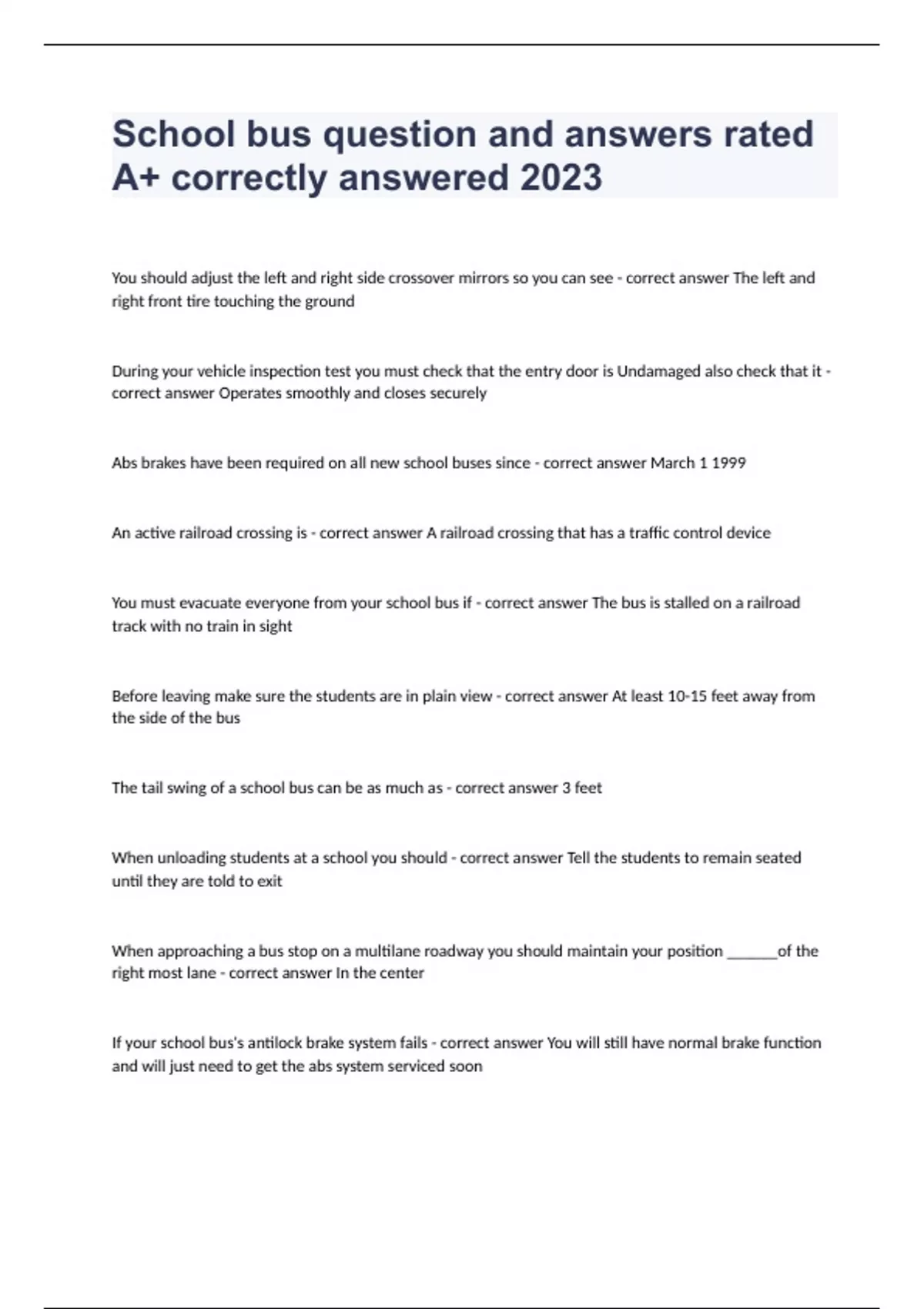 School bus question and answers rated A+ correctly answered 2023 You should adjust the left and right side crossover mirrors so you can see - correct answer The left and right front tire touching the ground During your vehicle inspection test you must check that the entry door is Undamaged also check that it - correct answer Operates smoothly and closes securely Abs brakes have been required on all new school buses since - correct answer March 1 1999 An active railroad crossing is - correct answer A railroad crossing that has a traffic control device You must evacuate everyone from your school bus if - correct answer The bus is stalled on a railroad track with no train in sight Before leaving make sure the students are in plain view - correct answer At least 10-15 feet away from the side of the bus The tail swing of a school bus can be as much as - correct answer 3 feet When unloading students at a school you should - correct answer Tell the students to remain seated until they are told to exit When approaching a bus stop on a multilane roadway you should maintain your position ______of the right most lane - correct answer In the center If your school bus's antilock brake system fails - correct answer You will still have normal brake function and will just need to get the abs system serviced soon
