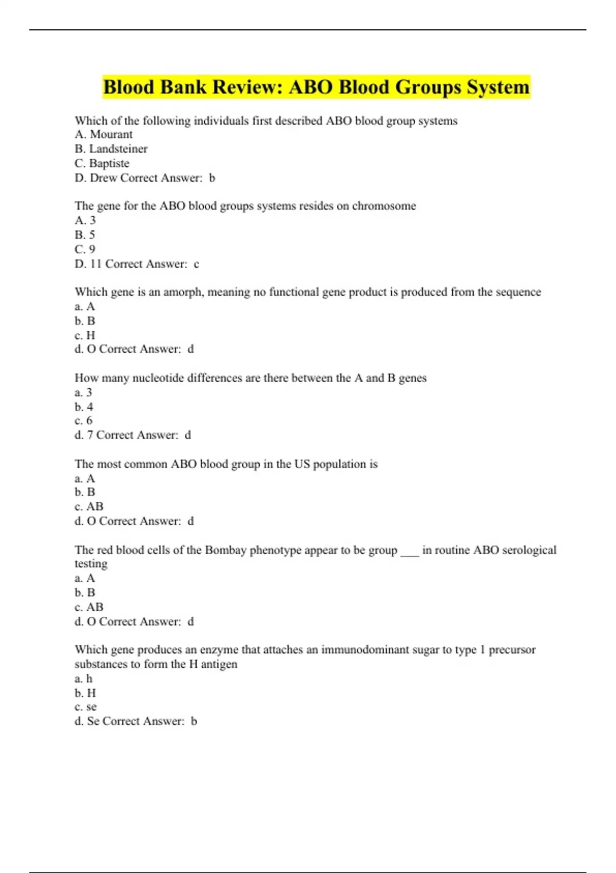 Blood Bank Review: ABO Blood Groups System Questions With Complete Solutions