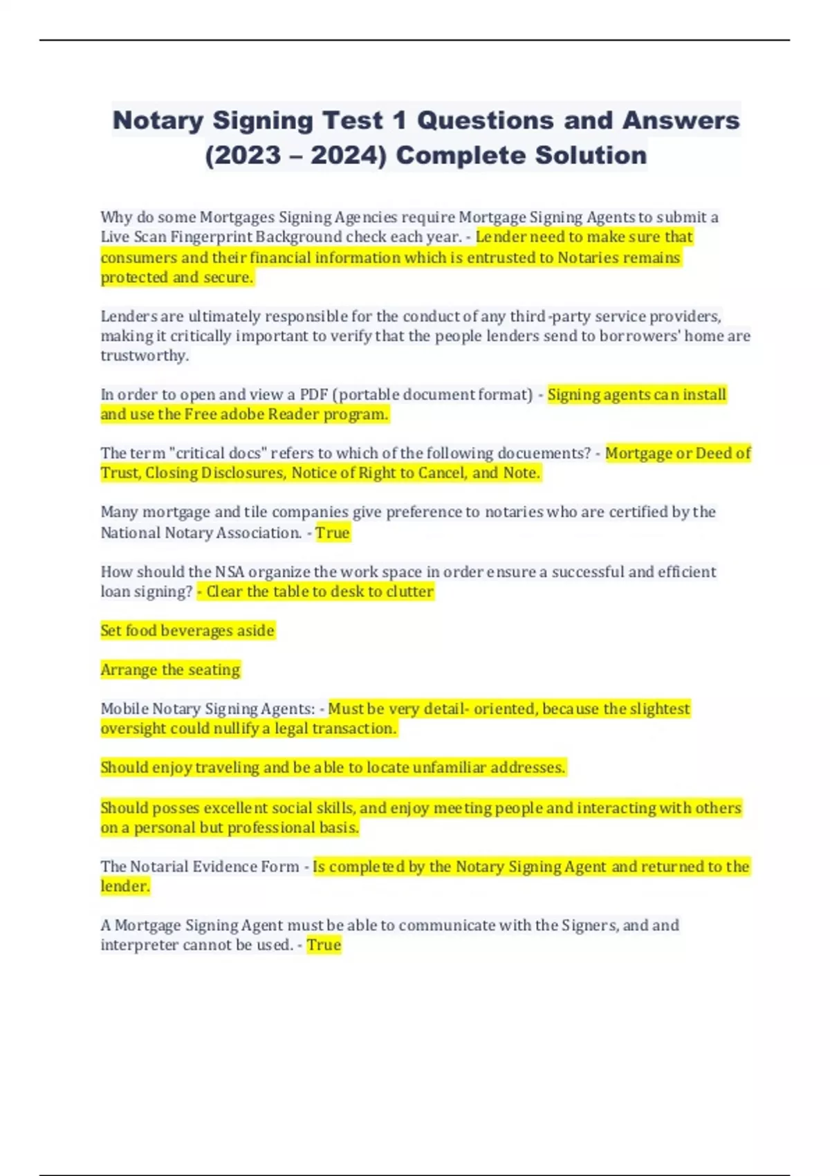 Notary Signing Test 1 Questions and Answers (2023 – 2024) Complete Solution