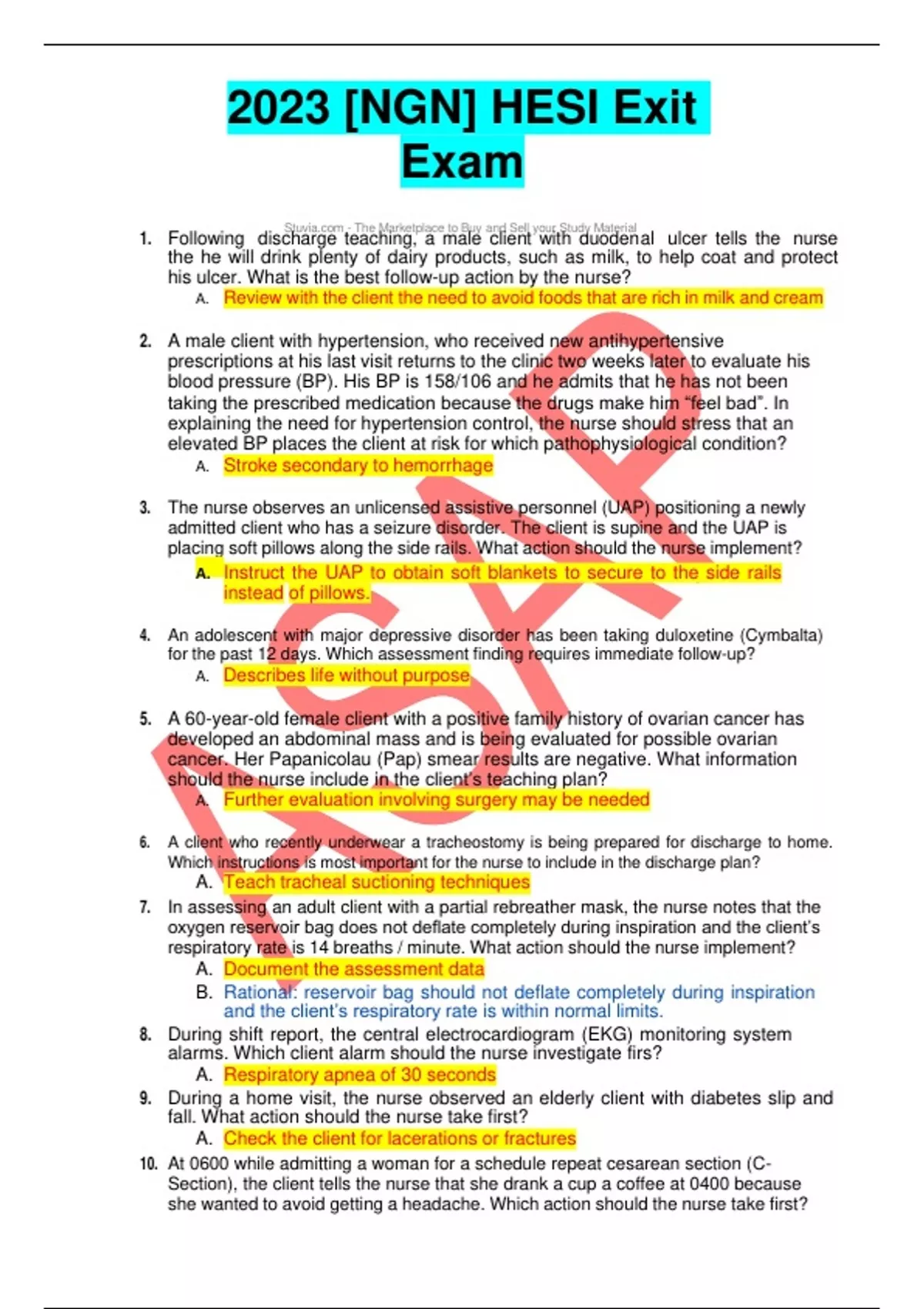 2023 [NGN] HESI Exit Exam 1. Following discS-eTahechMianrkget,plaacemtoaBluey acnldieSnelltyowuritShtuddyuMoadteerianl al ulcer tells the nurse the he will drink plenty of dairy products, such as milk, to help coat and protect his ulcer. What is the best follow-up action by the nurse? A. Review with the client the need to avoid foods that are rich in milk and cream 2. A male client with hypertension, who received new antihypertensive prescriptions at his last visit returns to the clinic two weeks later to evaluate his blood pressure (BP). His BP is 158/106 and he admits that he has not been taking the prescribed medication because the drugs make him “feel bad”. In explaining the need for hypertension control, the nurse should stress that an elevated BP places the client at risk for which pathophysiological condition? A. Stroke secondary to hemorrhage 3. The nurse observes an unlicensed assistive personnel (UAP) positioning a newly admitted client who has a seizure disorder. The client is supine and the UAP is placing soft pillows along the side rails. What action should the nurse implement? Instruct the UAP to obtain soft blankets to secure to the side rails instead of pillows. 4. An adolescent with major depressive disorder has been taking duloxetine (Cymbalta) for the past 12 days. Which assessment finding requires immediate follow-up? A. Describes life without purpose 5. A 60-year-old female client with a positive family history of ovarian cancer has developed an abdominal mass and is being evaluated for possible ovarian cancer. Her Papanicolau (Pap) smear results are negative. What information should the nurse include in the client’s teaching plan? A. Further evaluation involving surgery may be needed 6. A client who recently underwear a tracheostomy is being prepared for discharge to home. Which instructions is most important for the nurse to include in the discharge plan? A. Teach tracheal suctioning techniques 7. In assessing an adult client with a partial rebreather mask, the nurse notes that the oxygen reservoir bag does not deflate completely during inspiration and the client’s respiratory rate is 14 breaths / minute. What action should the nurse implement? A. Document the assessment data B. Rational: reservoir bag should not deflate completely during inspiration and the client’s respiratory rate is within normal limits. 8. During shift report, the central electrocardiogram (EKG) monitoring system alarms. Which client alarm should the nurse investigate firs? A. Respiratory apnea of 30 seconds 9. During a home visit, the nurse observed an elderly client with diabetes slip and fall. What action should the nurse take first? A. Check the client for lacerations or fractures 10. At 0600 while admitting a woman for a schedule repeat cesarean section (C- Section), the client tells the nurse that she drank a cup a coffee at 0400 because she wanted to avoid getting a headache. Which action should the nurse take first? A. Inform the anesthesia care provider 11. After placing a stethoscope as seen in the picture, the nurse auscultates S1 and S2 heart sounds. To determine if an S3 heart sound is present, what action should the nurse take first? A. Listen with the bell at the same location 12. A 66-year-old woman is retiring and will no longer have a health insurance through her place of employment. Which agency should the client be referred to by the employee health nurse for health insurance needs? 13. A client who is taking an or