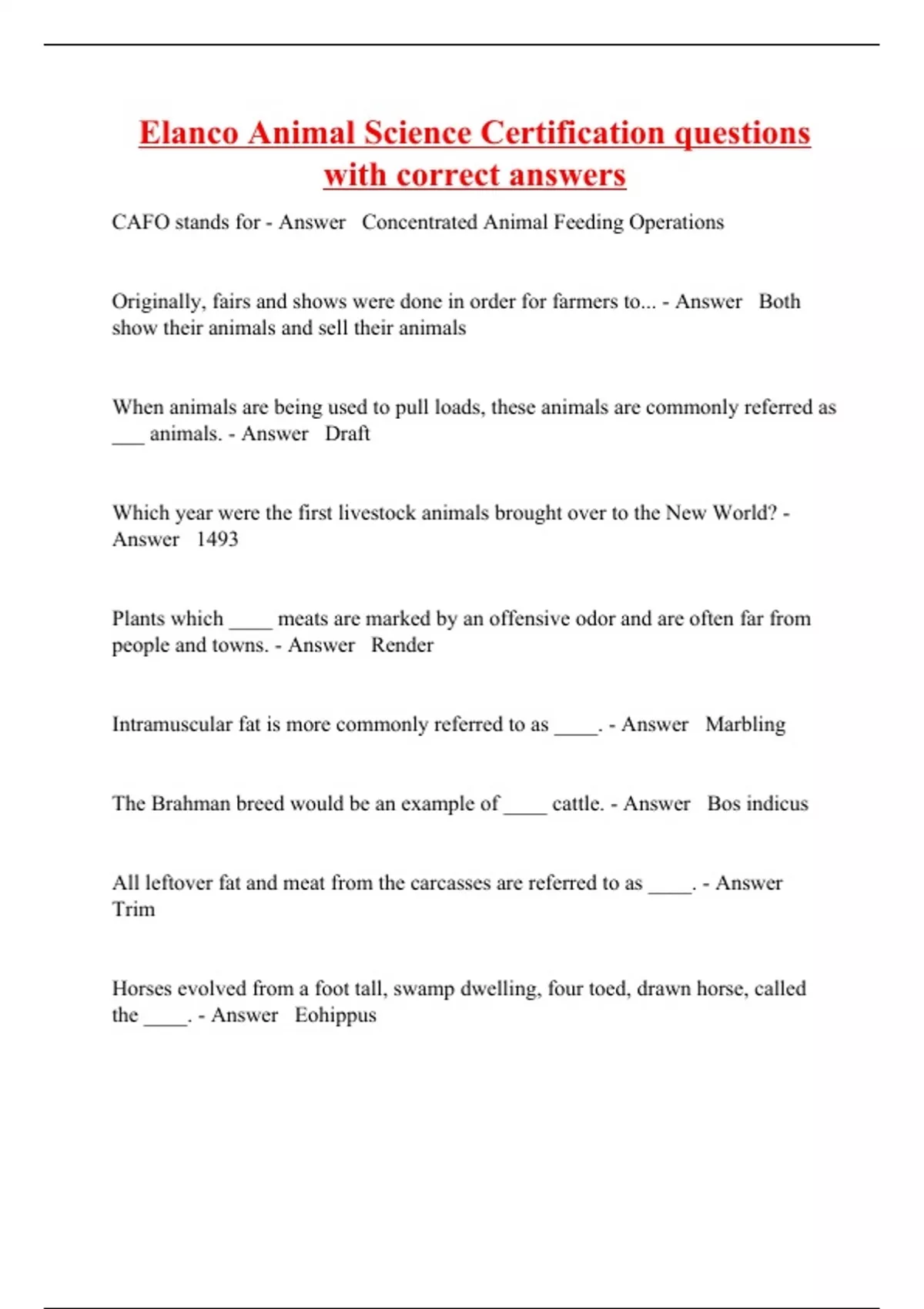 CAFO stands for - Answer Concentrated Animal Feeding Operations Originally, fairs and shows were done in order for farmers to... - Answer Both show their animals and sell their animals When animals are being used to pull loads, these animals are commonly referred as ___ animals. - Answer Draft Which year were the first livestock animals brought over to the New World? - Answer 1493 Plants which ____ meats are marked by an offensive odor and are often far from people and towns. - Answer Render Intramuscular fat is more commonly referred to as ____. - Answer Marbling The Brahman breed would be an example of ____ cattle. - Answer Bos indicus All leftover fat and meat from the carcasses are referred to as ____. - Answer Trim Horses evolved from a foot tall, swamp dwelling, four toed, drawn horse, called the ____. - Answer Eohippus