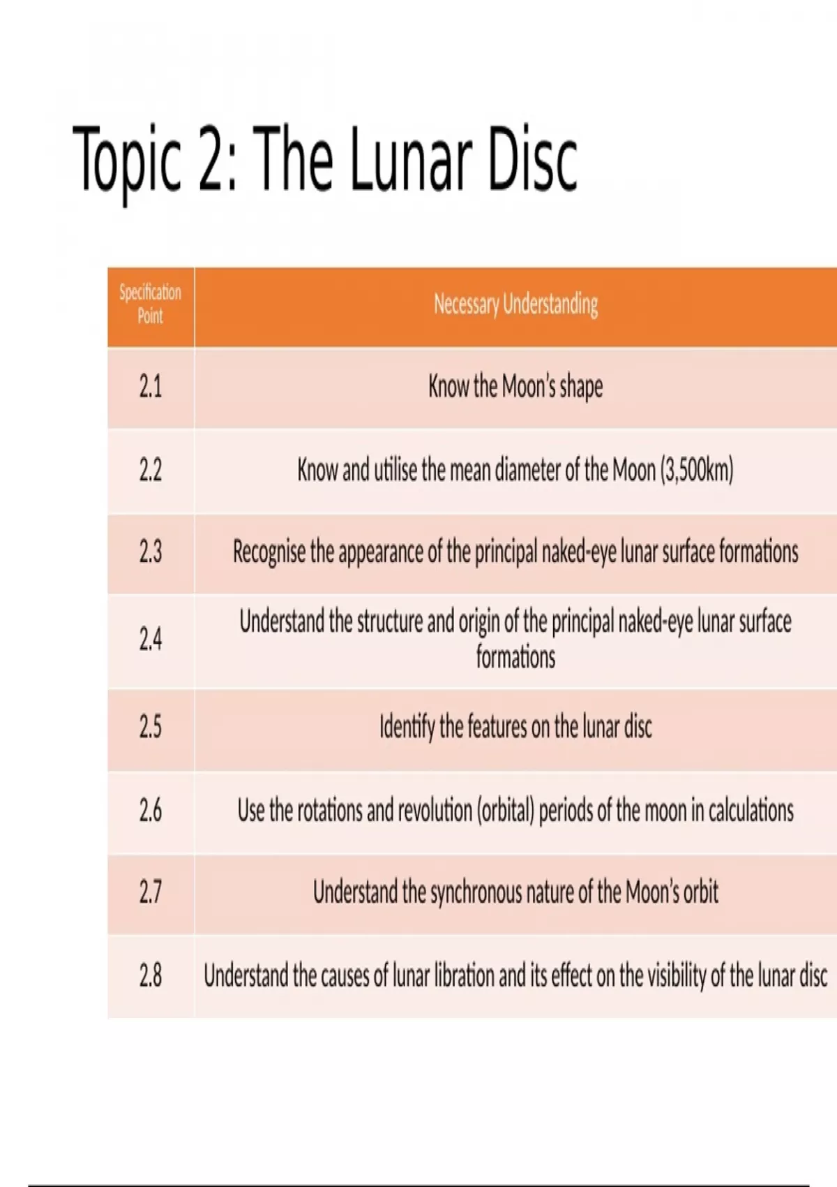 Summary and review notes of Edexcel GCSE Astronomy Paper 1, Topic 2 - The Lunar Disc. Here, there are comprehensive notes per specification point, topic-by-topic questions, and exam-style questions specifically related to the Topic. The "Lunar Disc" topic builds student's understanding of the shape of the Moon, appearences of the Lunar Disc, and the appearence of the Lunar Disc from the Earth's surface.