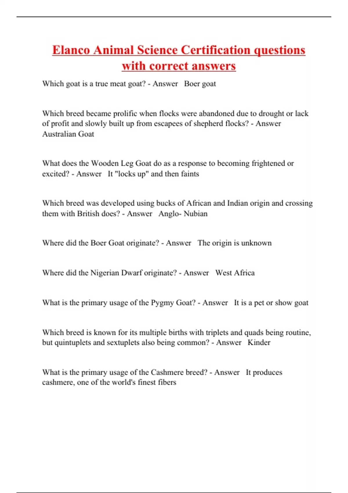 Which goat is a true meat goat? - Answer Boer goat Which breed became prolific when flocks were abandoned due to drought or lack of profit and slowly built up from escapees of shepherd flocks? - Answer Australian Goat What does the Wooden Leg Goat do as a response to becoming frightened or excited? - Answer It "locks up" and then faints Which breed was developed using bucks of African and Indian origin and crossing them with British does? - Answer Anglo- Nubian Where did the Boer Goat originate? - Answer The origin is unknown Where did the Nigerian Dwarf originate? - Answer West Africa What is the primary usage of the Pygmy Goat? - Answer It is a pet or show goat Which breed is known for its multiple births with triplets and quads being routine, but quintuplets and sextuplets also being common? - Answer Kinder What is the primary usage of the Cashmere breed? - Answer It produces cashmere, one of the world's finest fibers Which of the following breeds is used for the production