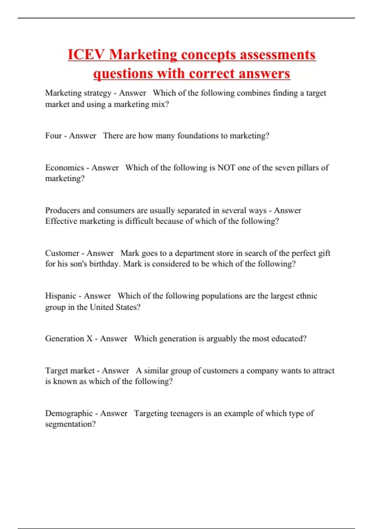 ICEV Marketing concepts assessments questions with correct answers