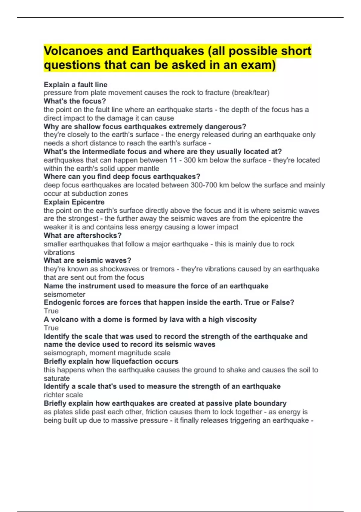 Volcanoes and Earthquakes (all possible short questions that can be asked in an exam) Explain a fault line pressure from plate movement causes the rock to fracture (break/tear) What's the focus? the point on the fault line where an earthquake starts - the depth of the focus has a direct impact to the damage it can cause Why are shallow focus earthquakes extremely dangerous? they're closely to the earth's surface - the energy released during an earthquake only needs a short distance to reach the earth's surface - What's the intermediate focus and where are they usually located at? earthquakes that can happen between 11 - 300 km below the surface - they're located within the earth's solid upper mantle Where can you find deep focus earthquakes? deep focus earthquakes are located between 300-700 km below the surface and mainly occur at subduction zones Explain Epicentre the point on the earth's surface directly above the focus and it is where seismic waves are the strongest - the further away the seismic waves are from the epicentre the weaker it is and contains less energy causing a lower impact What are aftershocks? smaller earthquakes that follow a major earthquake - this is mainly due to rock vibrations What are seismic waves? they're known as shockwaves or tremors - they're vibrations caused by an earthquake that are sent out from the focus Name the instrument used to measure the force of an earthquake seismometer Endogenic forces are forces that happen inside the earth. True or False? True