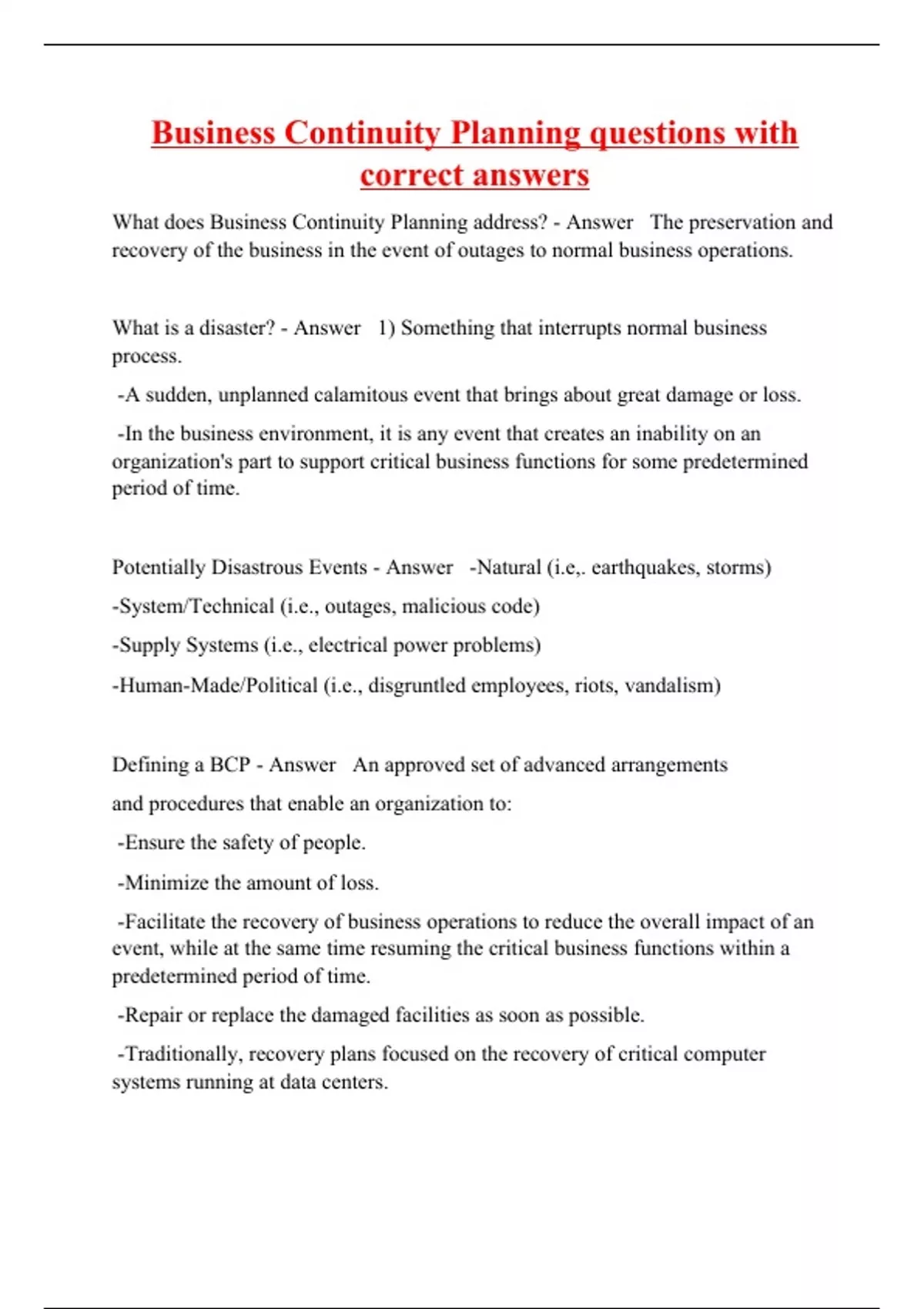 What does Business Continuity Planning address? - Answer The preservation and recovery of the business in the event of outages to normal business operations. What is a disaster? - Answer 1) Something that interrupts normal business process. -A sudden, unplanned calamitous event that brings about great damage or loss. -In the business environment, it is any event that creates an inability on an organization's part to support critical business functions for some predetermined period of time. Potentially Disastrous Events - Answer -Natural (i.e,. earthquakes, storms) -System/Technical (i.e., outages, malicious code) -Supply Systems (i.e., electrical power problems) -Human-Made/Political (i.e., disgruntled employees, riots, vandalism) Defining a BCP - Answer An approved set of advanced arrangements and procedures that enable an organization to: -Ensure the safety of people. -Minimize the amount of loss. -Facilitate the recovery of business operations to reduce the overall impact of an event, while at the same time resuming the critical business functions within a predetermined period of time. -Repair or replace the damaged facilities as soon as possible. -Traditionally, recovery plans focused on the recovery of critical computer systems running at data centers. -Today, recovery plans must also focus on the critical com