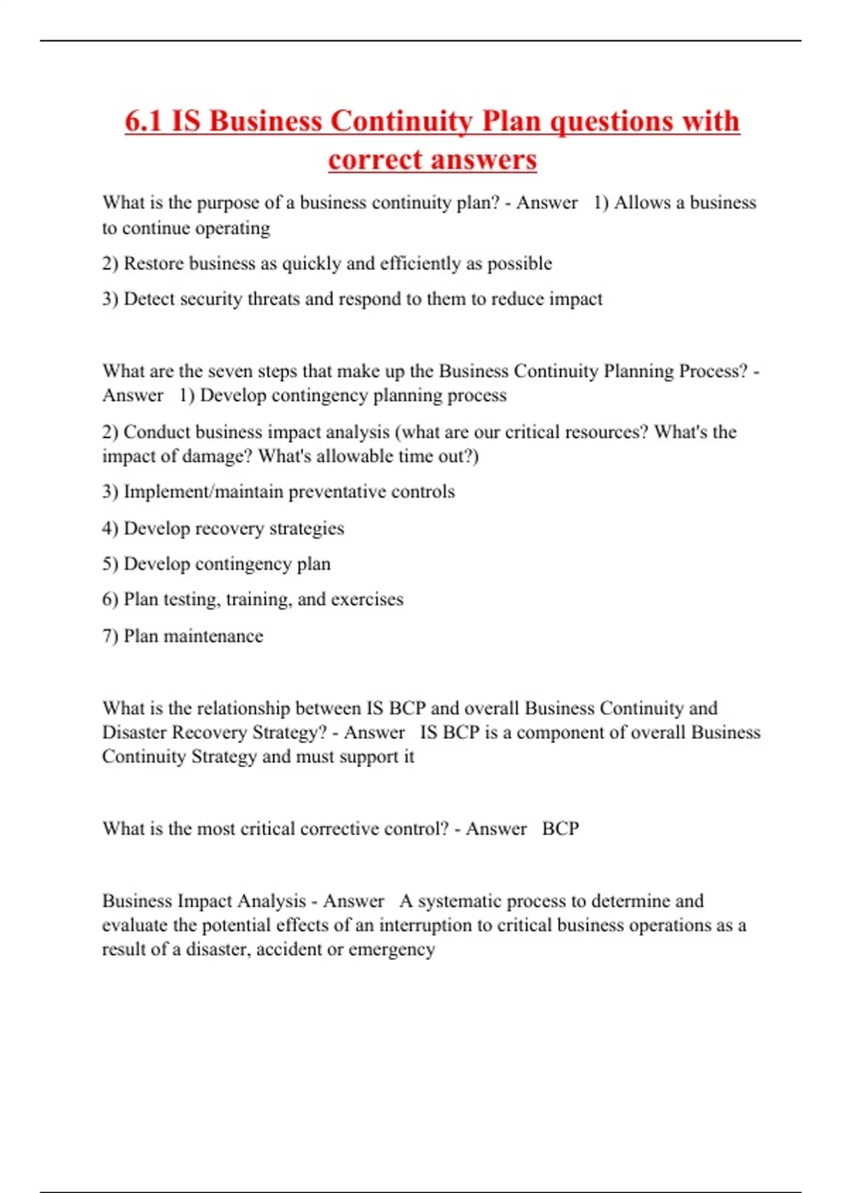 6.1 IS Business Continuity Plan questions with correct answers
