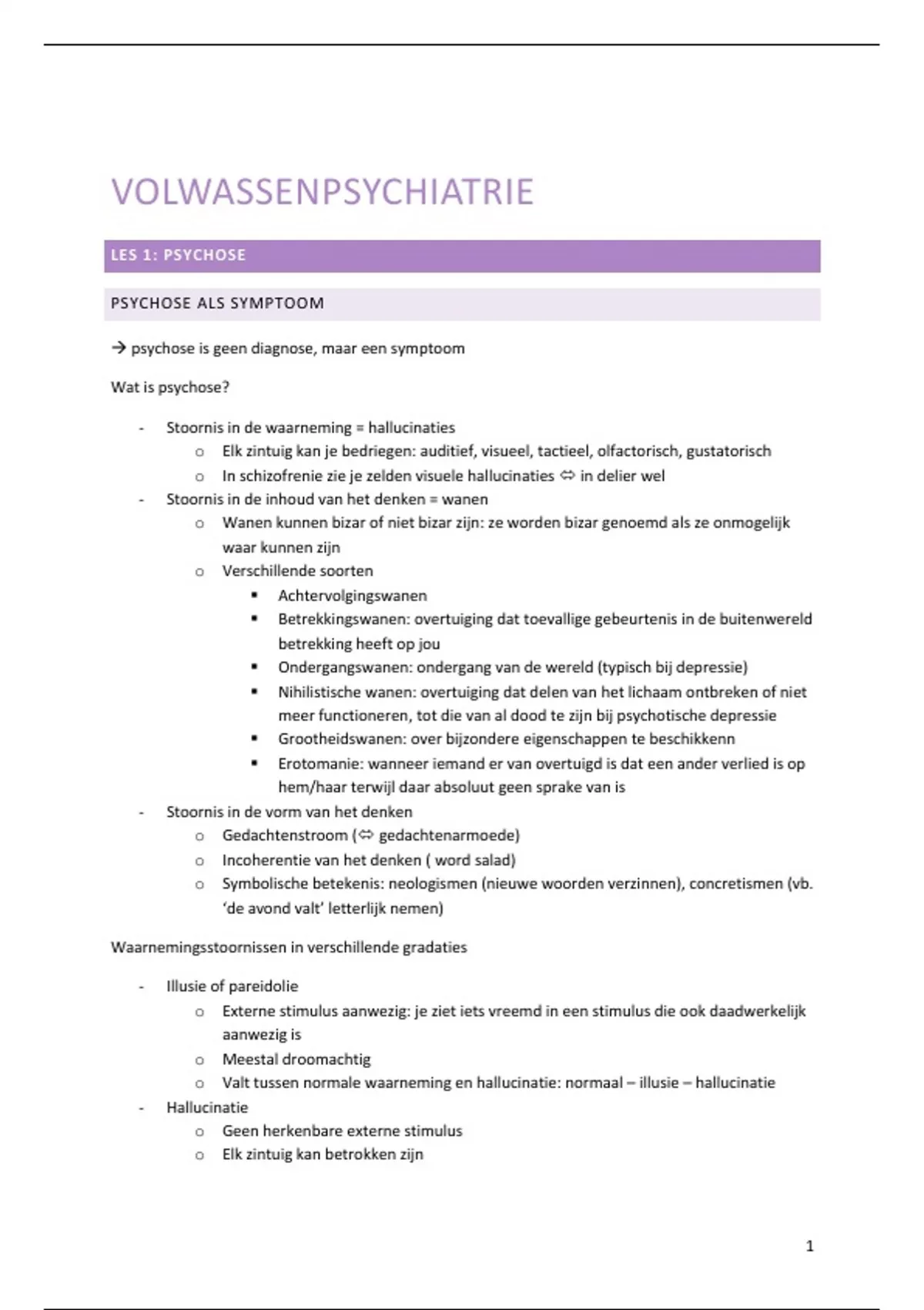 Samenvatting van de lessen volwassenpsychiatrie (slides + notities) docenten: prof. Claes, prof. De Wachter & prof. De Vrieze topics: psychose, depressie, bipolaire stoornis, trauma en dissociatie, herstelgerichte zorg, verslaving, psychiatrische urgenties, angst en dwang, somatische-symptoomstoornis en verwante stoornissen, capita selecte (slaapstoornissen, seksuele dysfuncties en dementie), voedings- en eetstoornissen