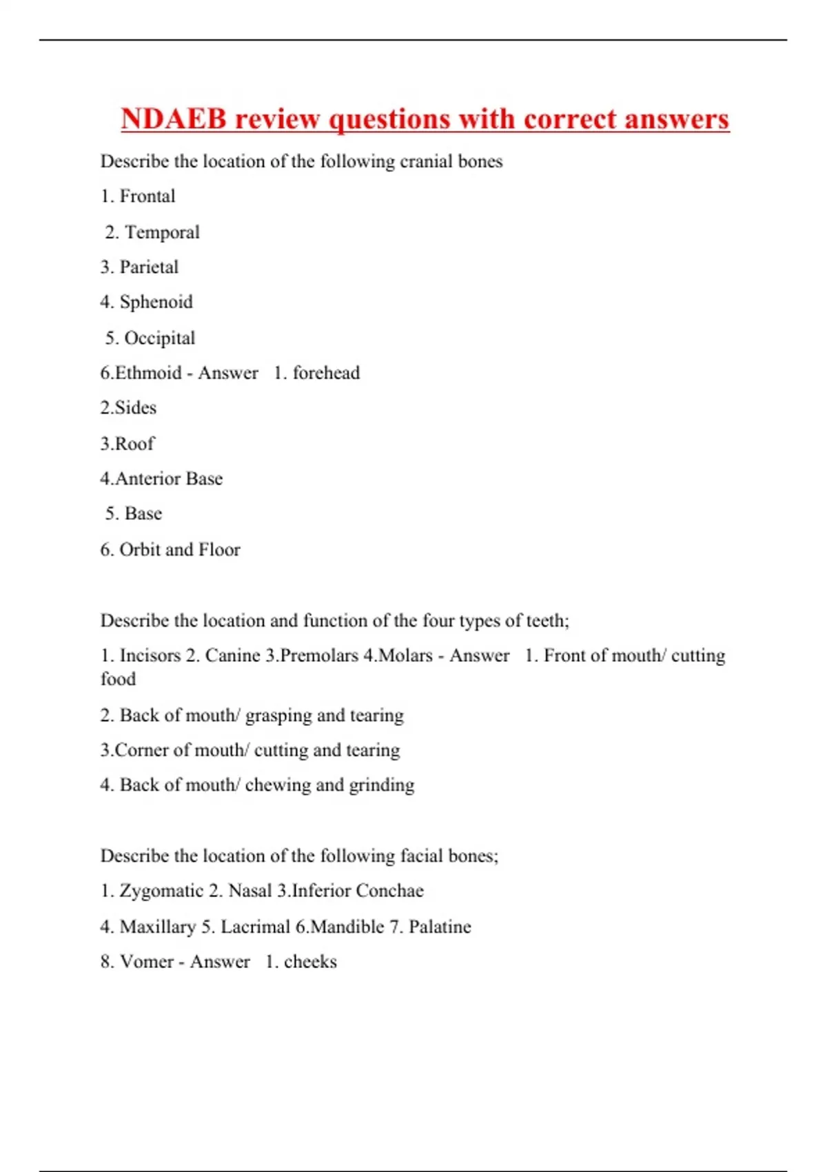 Describe the location of the following cranial bones 1. Frontal 2. Temporal 3. Parietal 4. Sphenoid 5. Occipital 6.Ethmoid - Answer 1. forehead 2.Sides 3.Roof 4.Anterior Base 5. Base 6. Orbit and Floor Describe the location and function of the four types of teeth; 1. Incisors 2. Canine 3.Premolars 4.Molars - Answer 1. Front of mouth/ cutting food 2. Back of mouth/ grasping and tearing 3.Corner of mouth/ cutting and tearing 4. Back of mouth/ chewing and grinding Describe the location of the following facial bones; 1. Zygomatic 2. Nasal 3.Inferior Conchae 4. Maxillary 5. Lacrimal 6.Mandible 7. Palatine 8. Vomer - Answer 1. cheeks