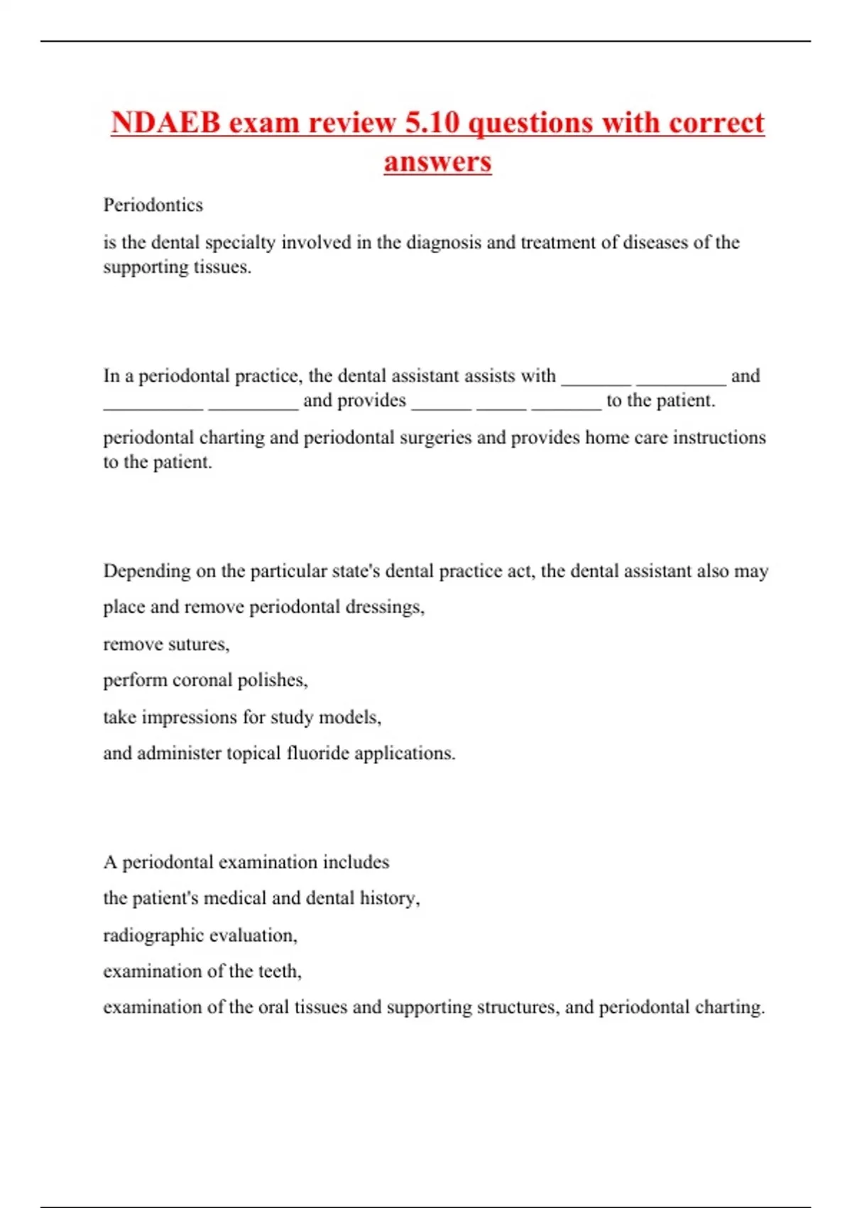 Periodontics is the dental specialty involved in the diagnosis and treatment of diseases of the supporting tissues. In a periodontal practice, the dental assistant assists with _______ _________ and __________ _________ and provides ______ _____ _______ to the patient. periodontal charting and periodontal surgeries and provides home care instructions to the patient. Depending on the particular state's dental practice act, the dental assistant also may place and remove periodontal dressings, remove sutures, perform coronal polishes, take impressions for study models, and administer topical fluoride applications. A periodontal examination includes the patient's medical and dental history, radiographic evaluation, examination of the teeth,