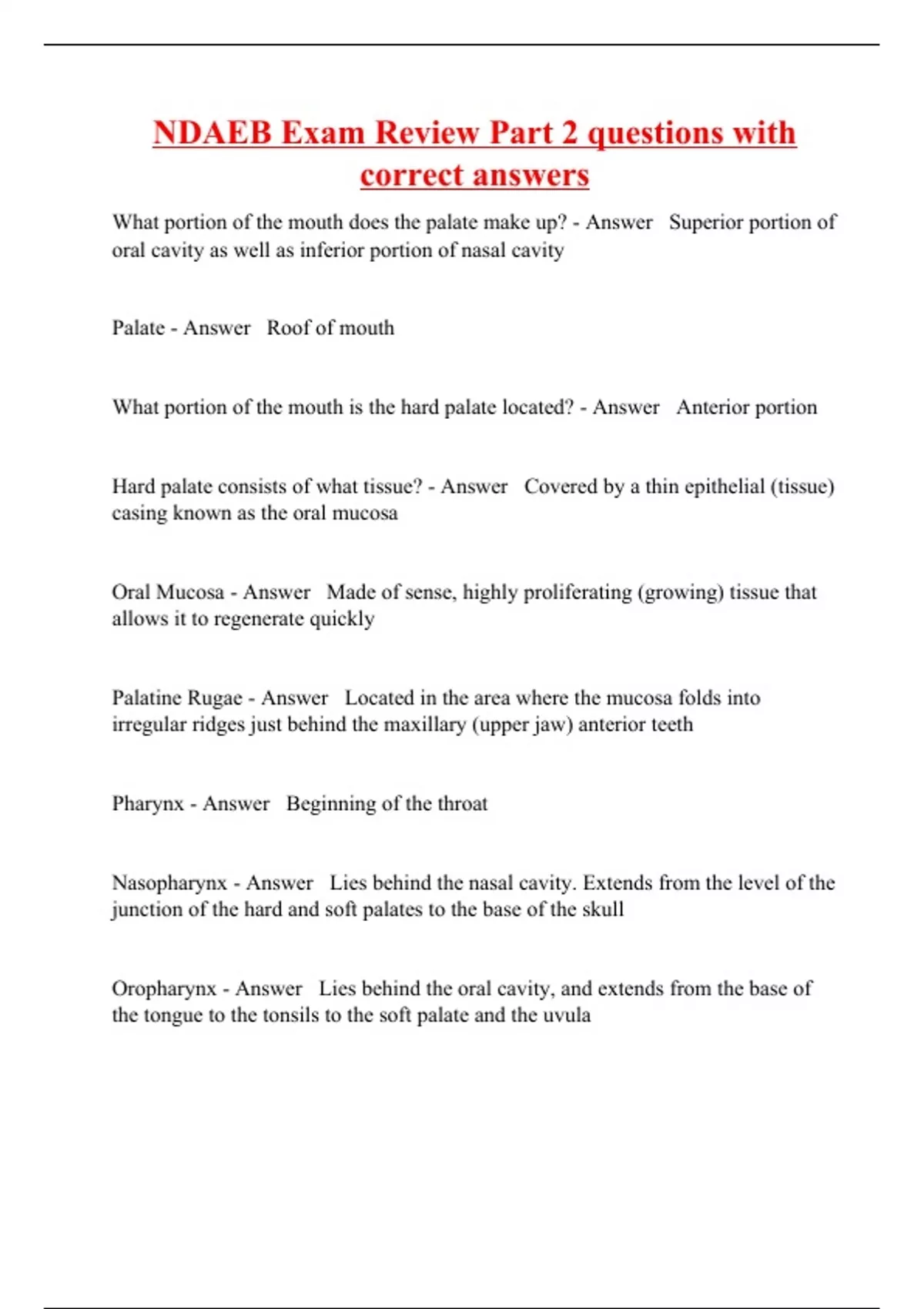 What portion of the mouth does the palate make up? - Answer Superior portion of oral cavity as well as inferior portion of nasal cavity Palate - Answer Roof of mouth What portion of the mouth is the hard palate located? - Answer Anterior portion Hard palate consists of what tissue? - Answer Covered by a thin epithelial (tissue) casing known as the oral mucosa Oral Mucosa - Answer Made of sense, highly proliferating (growing) tissue that allows it to regenerate quickly Palatine Rugae - Answer Located in the area where the mucosa folds into irregular ridges just behind the maxillary (upper jaw) anterior teeth