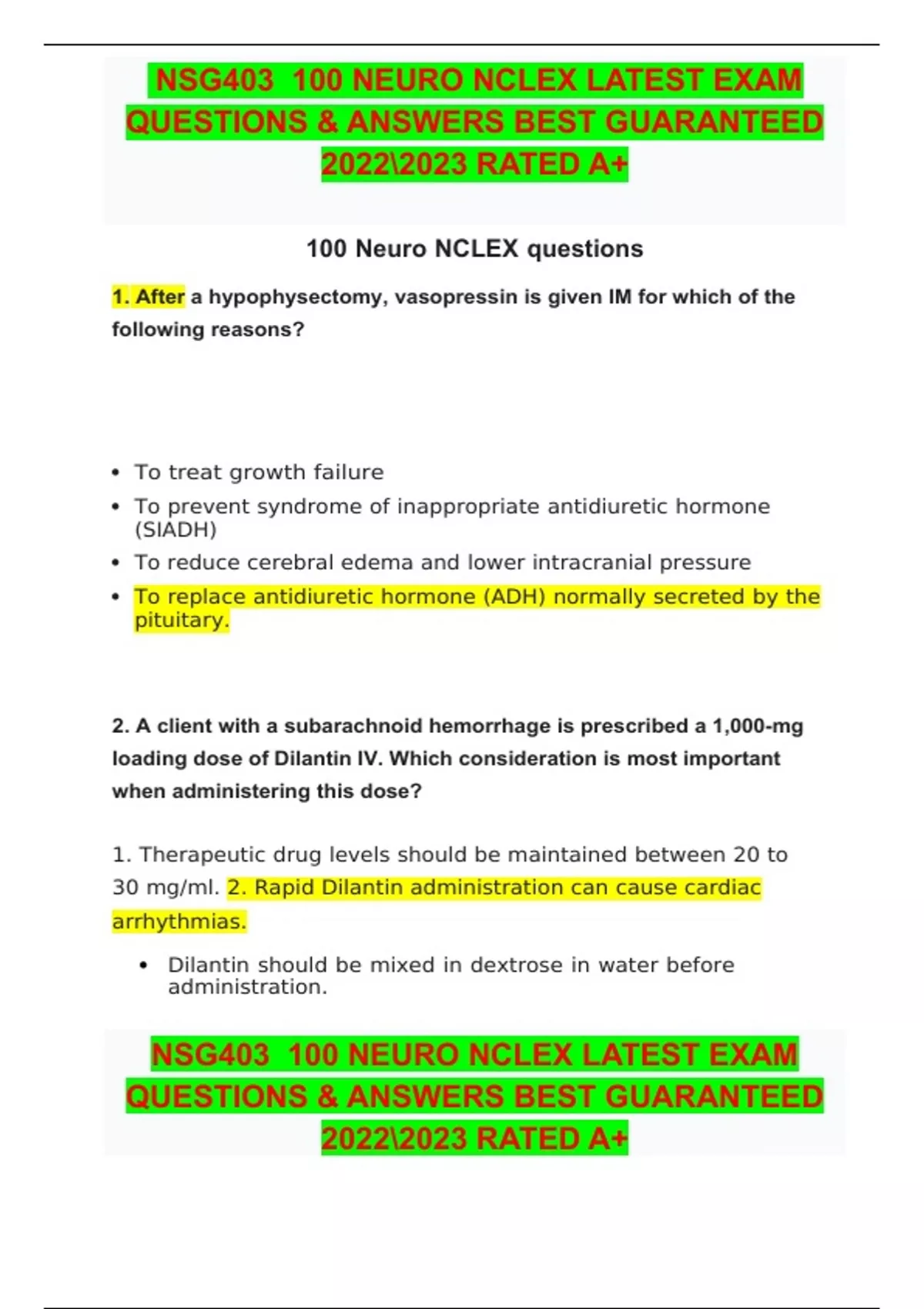 NSG403 100 NEURO NCLEX LATEST EXAM QUESTIONS & ANSWERS BEST GUARANTEED RATED A+
