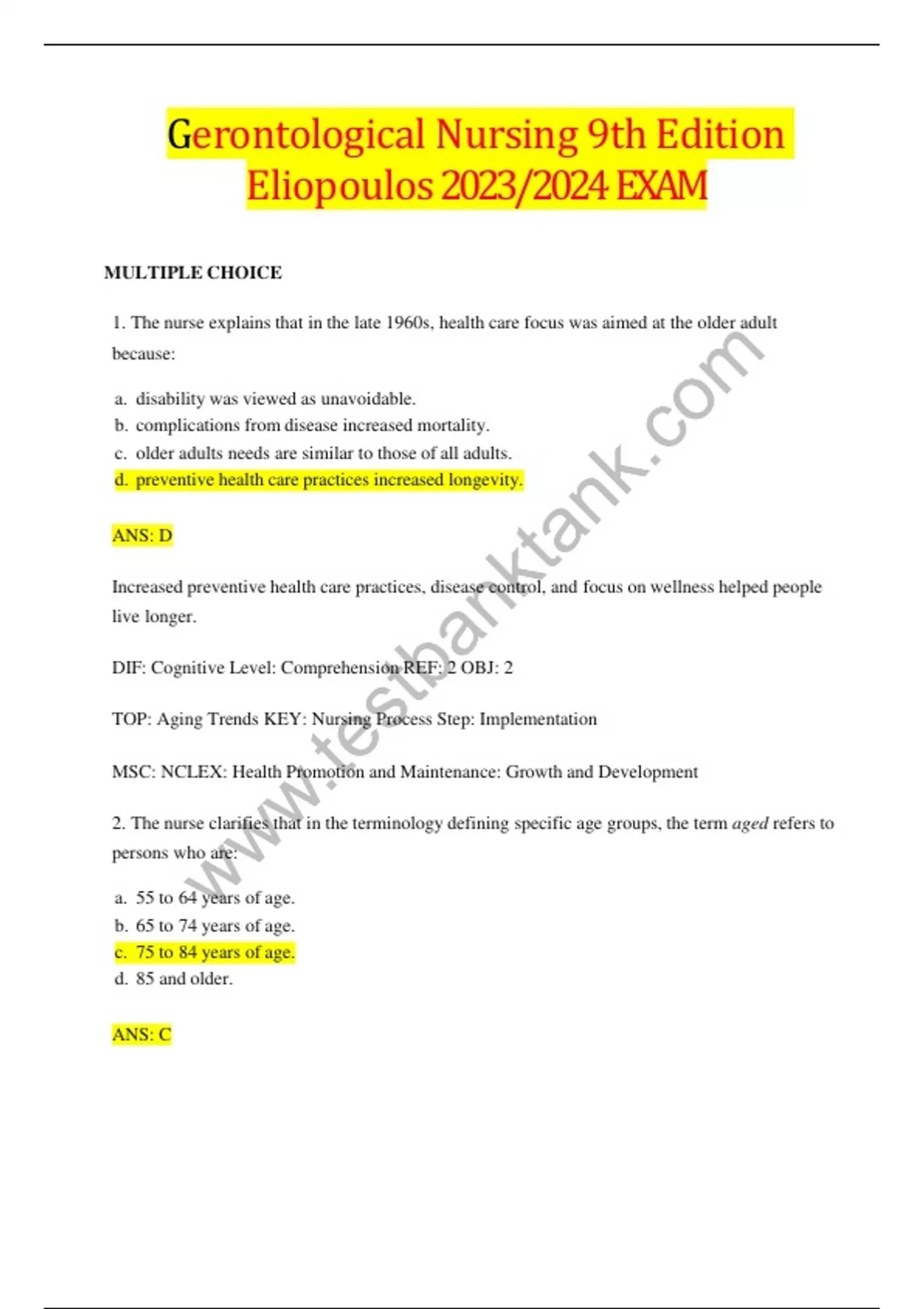 Gerontological Nursing 9th Edition Eliopoulos 2023/2024 EXAM MULTIPLE CHOICE 1. The nurse explains that in the late 1960s, health care focus was aimed at the older adult because: a. disability was viewed as unavoidable. b. complications from disease increased mortality. c. older adults needs are similar to those of all adults. d. preventive health care practices increased longevity. ANS: D Increased preventive health care practices, disease control, and focus on wellness helped people live longer. DIF: Cognitive Level: Comprehension REF: 2 OBJ: 2 TOP: Aging Trends KEY: Nursing Process Step: Implementation MSC: NCLEX: Health Promotion and Maintenance: Growth and Development 2. The nurse clarifies that in the terminology defining specific age groups, the term aged refers to persons who are: a. 55 to 64 years of age. b. 65 to 74 years of age. c. 75 to 84 years of age. d. 85 and older. ANS: C The term aged refers to persons who are 75 to 84 years of age. DIF: Cognitive Level: Comprehension REF: 2, Table 1-1 OBJ: 1 TOP: Age Categories KEY: Nursing Process Step: Implementation MSC: NCLEX: Health Promotion and Maintenance: Growth and Development 3. The nurse cautions that ageism is a mindset that influences persons to: a. discriminate against persons solely on the basis of age. b. fear aging. c. be culturally sensitive to concerns of aging. d. focus on resources for the older adult. ANS: A Ageism is a negative belief pattern that influences persons to discriminate against persons solely on the basis of age and can lead to destructive behaviors toward the older adult. DIF: Cognitive Level: Comprehension REF: 5 OBJ: 3 TOP: Ageism KEY: Nursing Process Step: Implementation MSC: NCLEX: Psychosocial Integrity: Psychosocial Adaptation 4. The nurse points out that the most beneficial legislation that has influenced health care for the older adult is: a. Medicare and Medicaid. b. elimination of the mandatory retirement age. c. the Americans with Disabilities Act. d. the Drug Benefit Program. ANS: A The broadest sweeping legislation beneficial to the older adult is Medicare and Medicaid. DIF: Cognitive Level: Application REF: 16 OBJ: 6 TOP: Legislation KEY: Nursing Process Step: Implementation MSC: NCLEX: N/A 5. The nurse clarifies that a housing option for the older adult that offers the privacy of an apartment with restaurant-style meals and some medical and personal care services is the: a. government-subsidized housing. b. long-term care facility. c. assisted-living center. d. group housing plan. ANS: C Assisted-living arrangements offer the privacy of an apartment or condominium with meals prepared and served, limited medical care, and a variety of personal services. DIF: Cognitive Level: Application REF: 14 OBJ: 9 TOP: Housing Options KEY: Nursing Process Step: Implementation MSC: NCLEX: Physiological Integrity: Physiological Adaptation 6. The 75-year-old man who has been hospitalized following a severe case of pneumonia is concerned about his mounting hospital bill and asks if his Medicare coverage will pay for his care. The nurses most helpful response is Yes. Medicare: a. pays 100% of all medical costs for persons older than 65. b. Part B pays hospital costs and physician fees. c. Part A pays for inpatient hospital costs. d. Part D pays 80% of the charges made by physicians. ANS: C Medicare Part A pays inpatient hospital costs, Part B pays 80% of physicians charges, and Part D helps defray prescription drug costs.