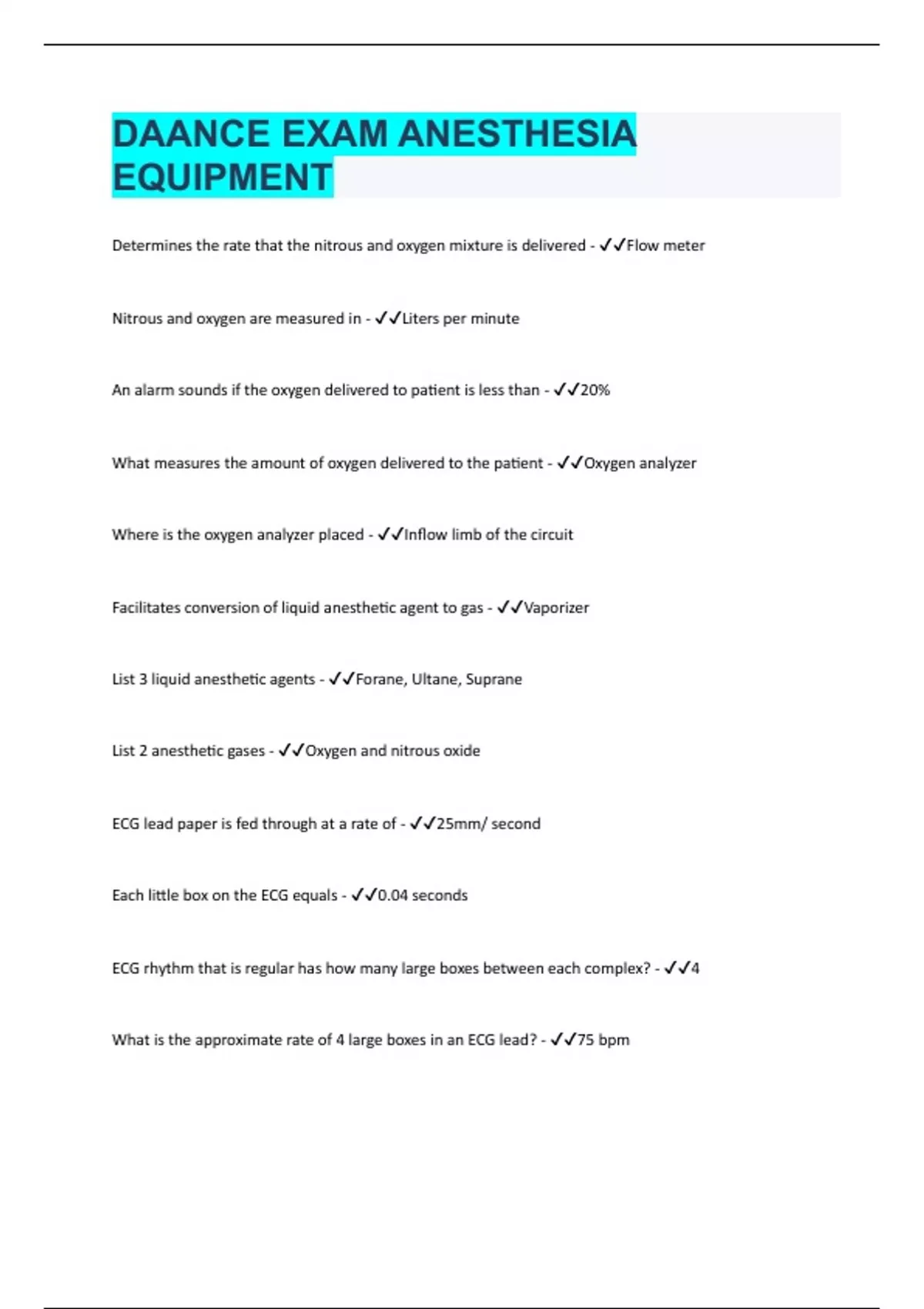 Determines the rate that the nitrous and oxygen mixture is delivered - Flow meter Nitrous and oxygen are measured in - Liters per minute An alarm sounds if the oxygen delivered to patient is less than - 20% What measures the amount of oxygen delivered to the patient - Oxygen analyzer Where is the oxygen analyzer placed - Inflow limb of the circuit Facilitates conversion of liquid anesthetic agent to gas - Vaporizer List 3 liquid anesthetic agents - Forane, Ultane, Suprane List 2 anesthetic gases - Oxygen and nitrous oxide ECG lead paper is fed through at a rate of - 25mm/ second Each little box on the ECG equals - 0.04 seconds ECG rhythm that is regular has how many large boxes between each complex? - 4 What is the approximate rate of 4 large boxes in an ECG lead? - 75 bpm