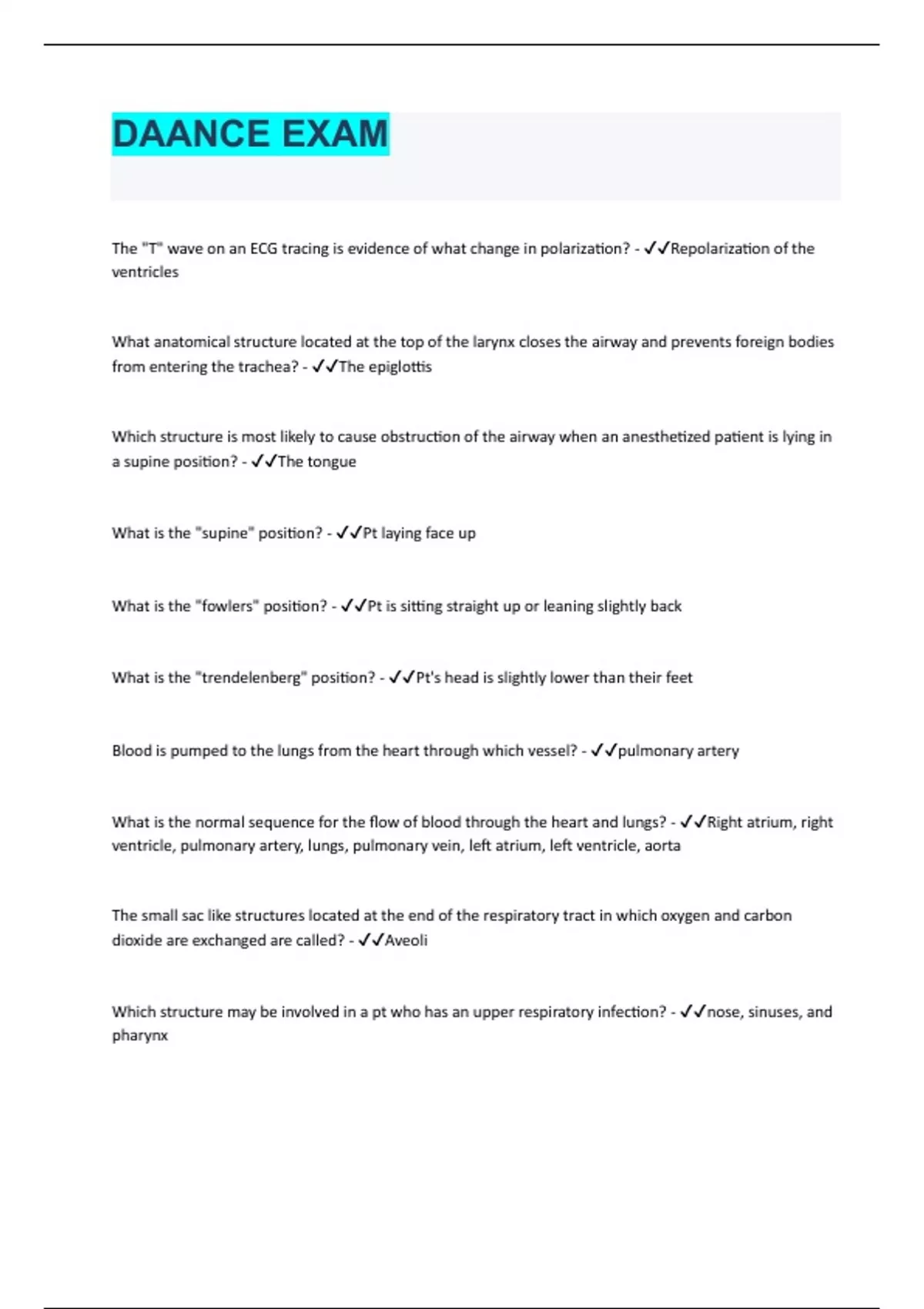 The "T" wave on an ECG tracing is evidence of what change in polarization? - Repolarization of the ventricles What anatomical structure located at the top of the larynx closes the airway and prevents foreign bodies from entering the trachea? - The epiglottis Which structure is most likely to cause obstruction of the airway when an anesthetized patient is lying in a supine position? - The tongue What is the "supine" position? - Pt laying face up What is the "fowlers" position? - Pt is sitting straight up or leaning slightly back What is the "trendelenberg" position? - Pt's head is slightly lower than their feet Blood is pumped to the lungs from the heart through which vessel? - pulmonary artery What is the normal sequence for the flow of blood through the heart and lungs? - Right atrium, right ventricle, pulmonary artery, lungs, pulmonary vein, left atrium, left ventricle, aorta The small sac like structures located at the end of the respiratory tract in which oxygen and carbon dioxide are exchanged are called? - Aveoli Which structure may be involved in a pt who has an upper respiratory infection? - nose, sinuses, and pharynx