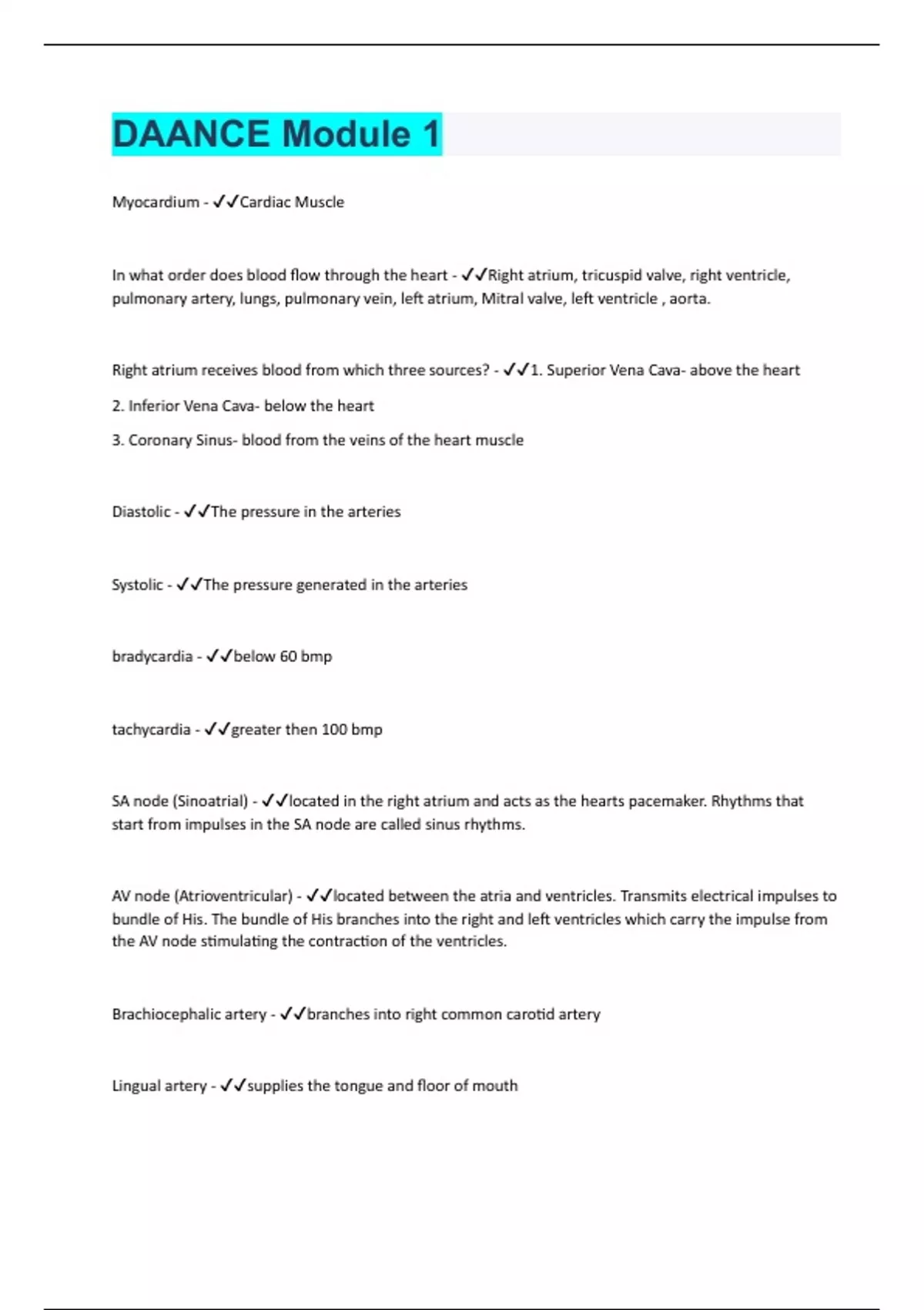 Myocardium - Cardiac Muscle In what order does blood flow through the heart - Right atrium, tricuspid valve, right ventricle, pulmonary artery, lungs, pulmonary vein, left atrium, Mitral valve, left ventricle , aorta. Right atrium receives blood from which three sources? - 1. Superior Vena Cava- above the heart 2. Inferior Vena Cava- below the heart 3. Coronary Sinus- blood from the veins of the heart muscle Diastolic - The pressure in the arteries Systolic - The pressure generated in the arteries bradycardia - below 60 bmp tachycardia - greater then 100 bmp SA node (Sinoatrial) - located in the right atrium and acts as the hearts pacemaker. Rhythms that start from impulses in the SA node are called sinus rhythms. AV node (Atrioventricular) - located between the atria and ventricles. Transmits electrical impulses to bundle of His. The bundle of His branches into the right and left ventricles which carry the impulse from the AV node stimulating the contraction of the ventricles. Brachiocephalic artery - branches into right common carotid artery Lingual artery - supplies the tongue and floor of mouth